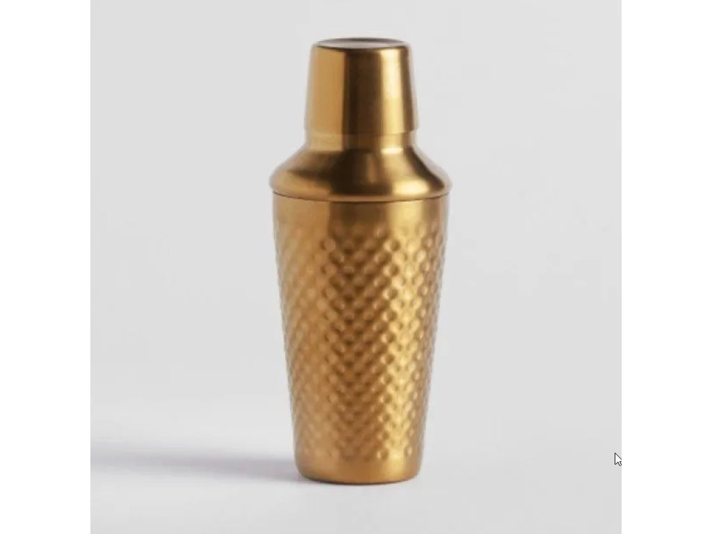 Zlatý koktailový šejker s elegantným textúrovaným povrchom. Perfektný doplnok pre každého milovníka koktailov, ktorý prinesie nádych luxusu do domáceho baru.