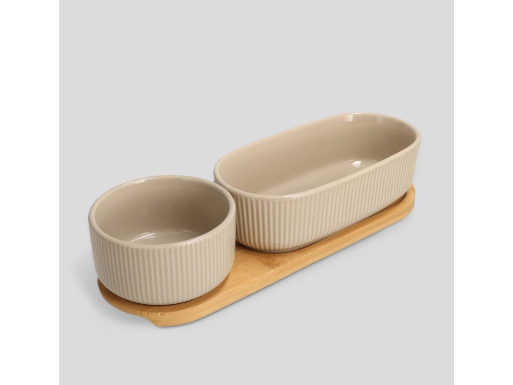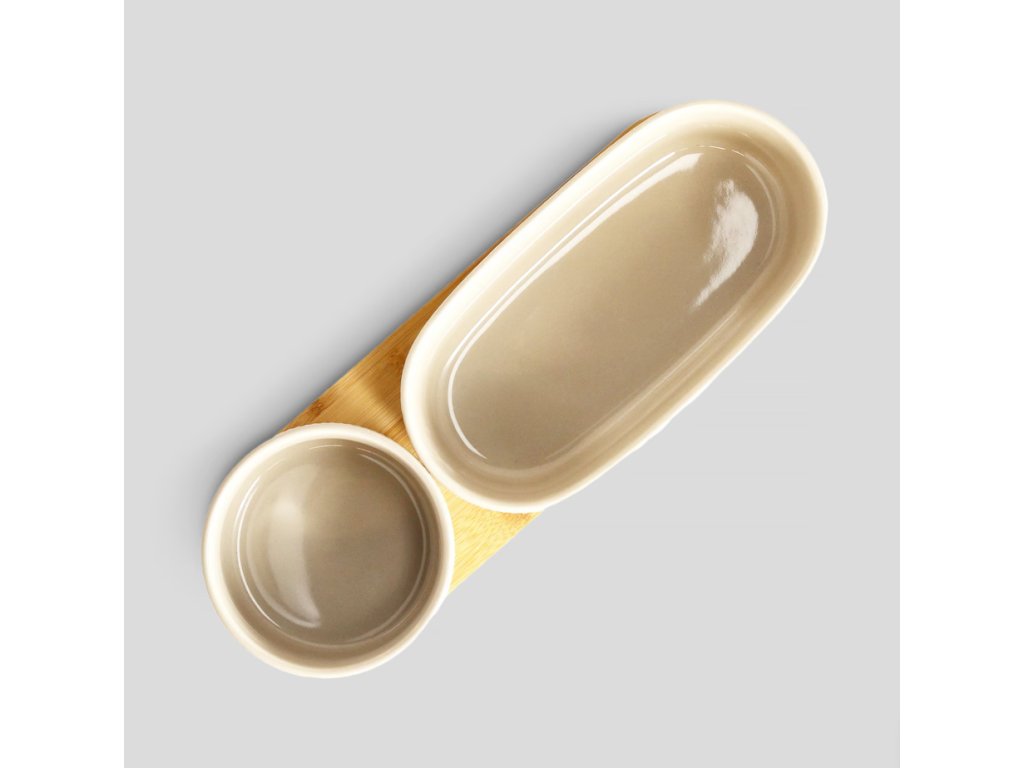 Štýlová servírovacia tácka z porcelánu v béžovej farbe, s elegantným doplnkom z prírodného bambusu. Je ideálnou voľbou na servírovanie koláčov, ovocia alebo občerstvenia. Kombinácia materiálov jej dodáva moderný a prírodný charakter, dokonale sa hodiaci k rôznym aranžmánom stola. Je to praktická a estetická ozdoba každej kuchyne a jedálne.