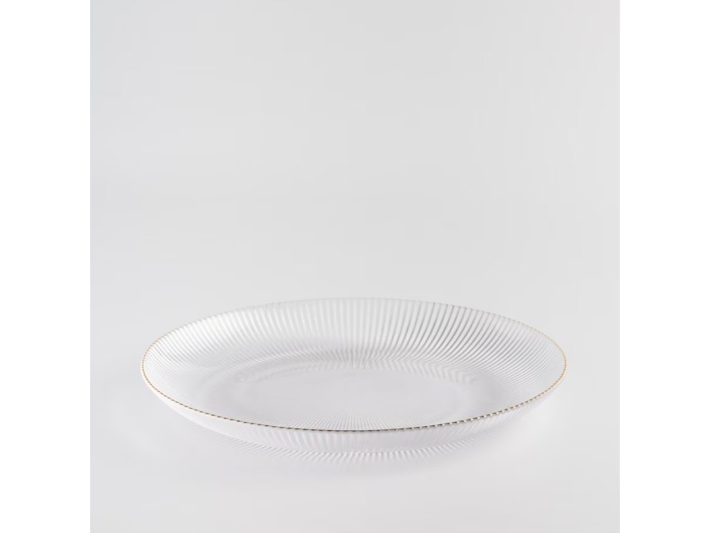 Štýlová patera (servírovací podnos/stojan) vyrobená zo sodnovápenatého skla, ozdobená elegantnou zlatou obrubou. Ideálne sa hodí na servírovanie ovocia, občerstvenia či sladkostí. Jej výnimočný dizajn dodá šarm každému prestretému stolu, čím sa stáva vynikajúcou voľbou na rôzne oslavy a príležitosti.