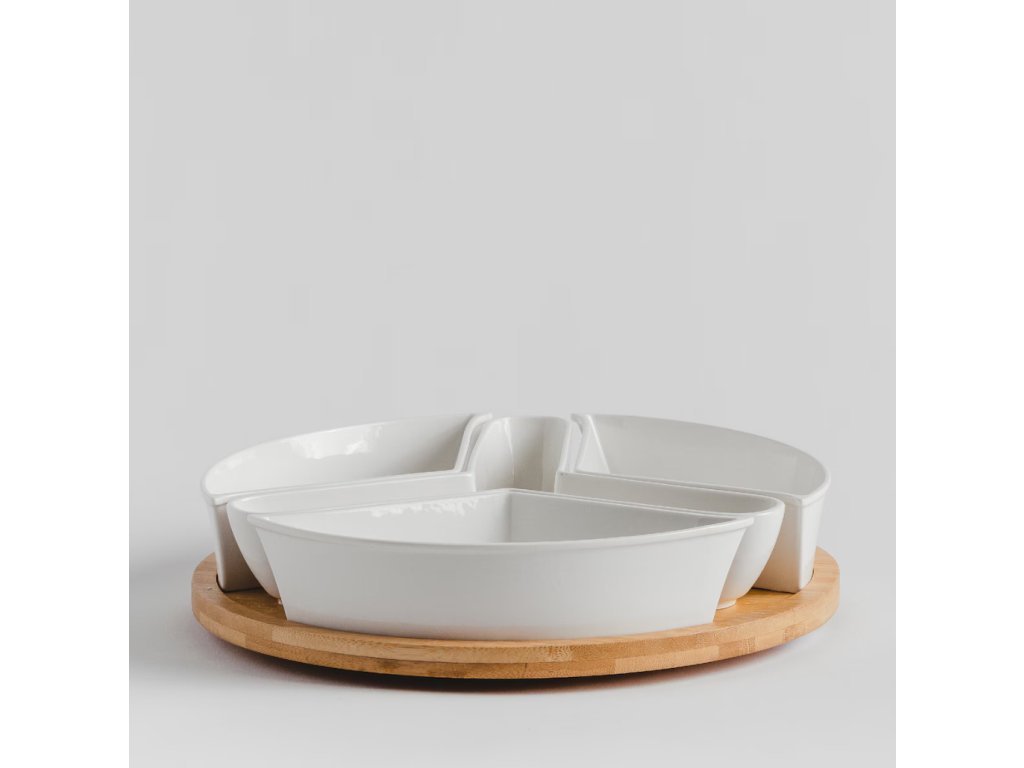 Súprava porcelánových misiek s okrúhlym bambusovým podstavcom je riešenie, ktoré je rovnako praktické ako aj estetické.