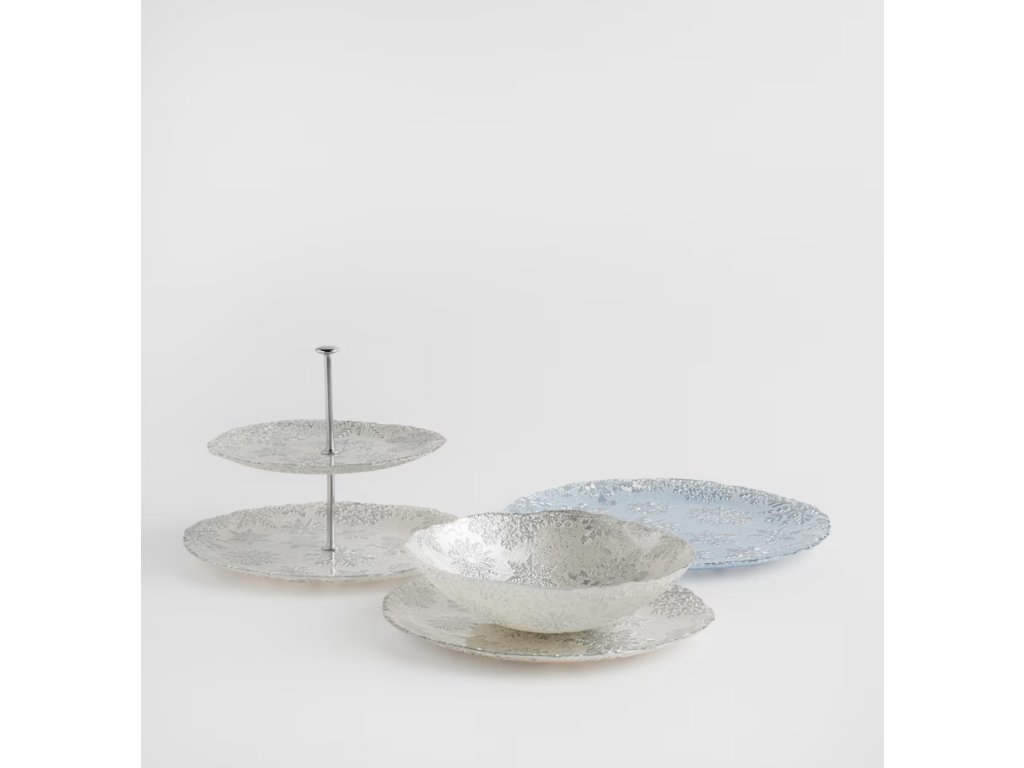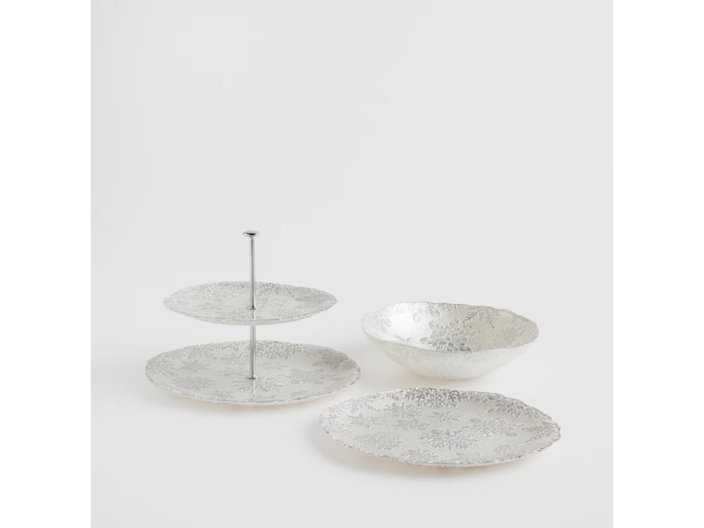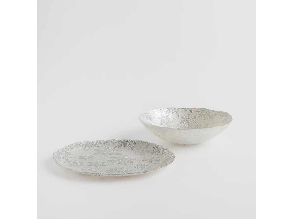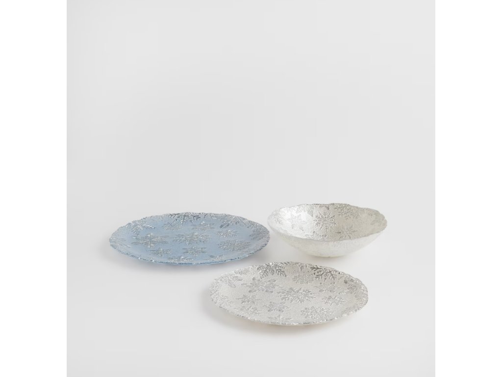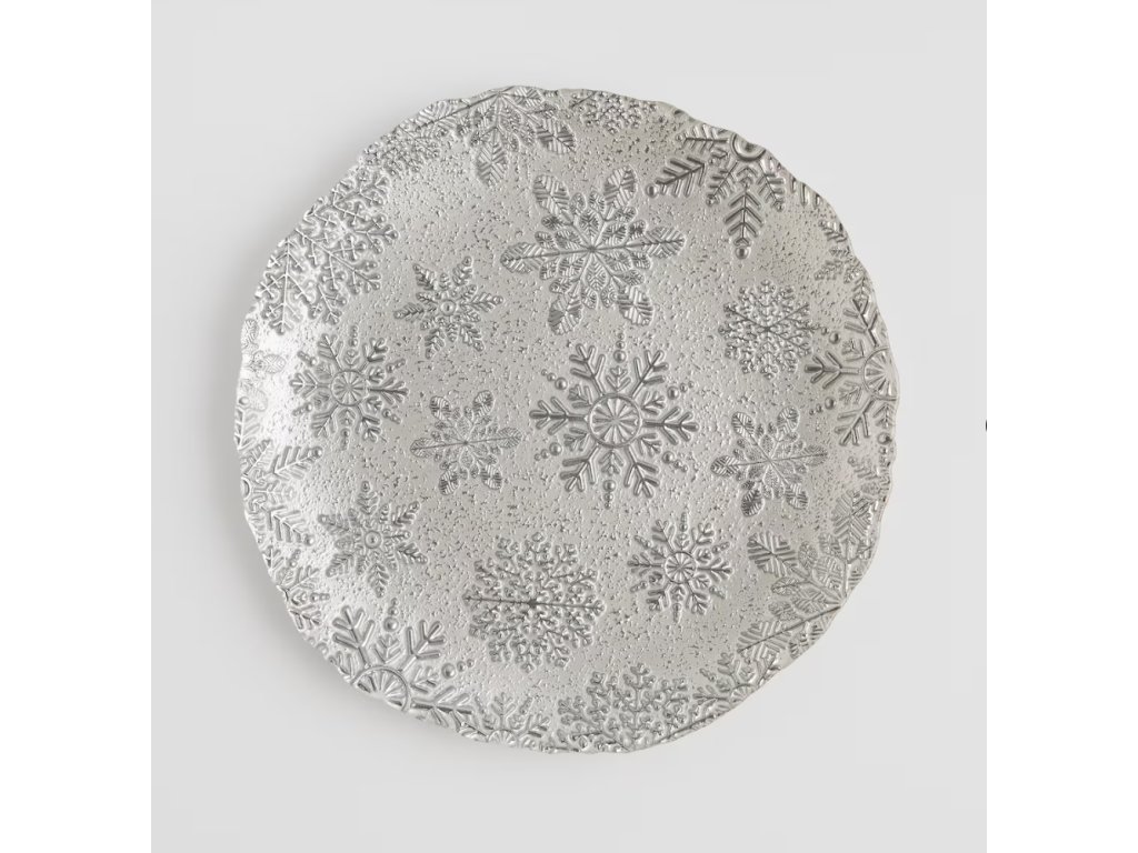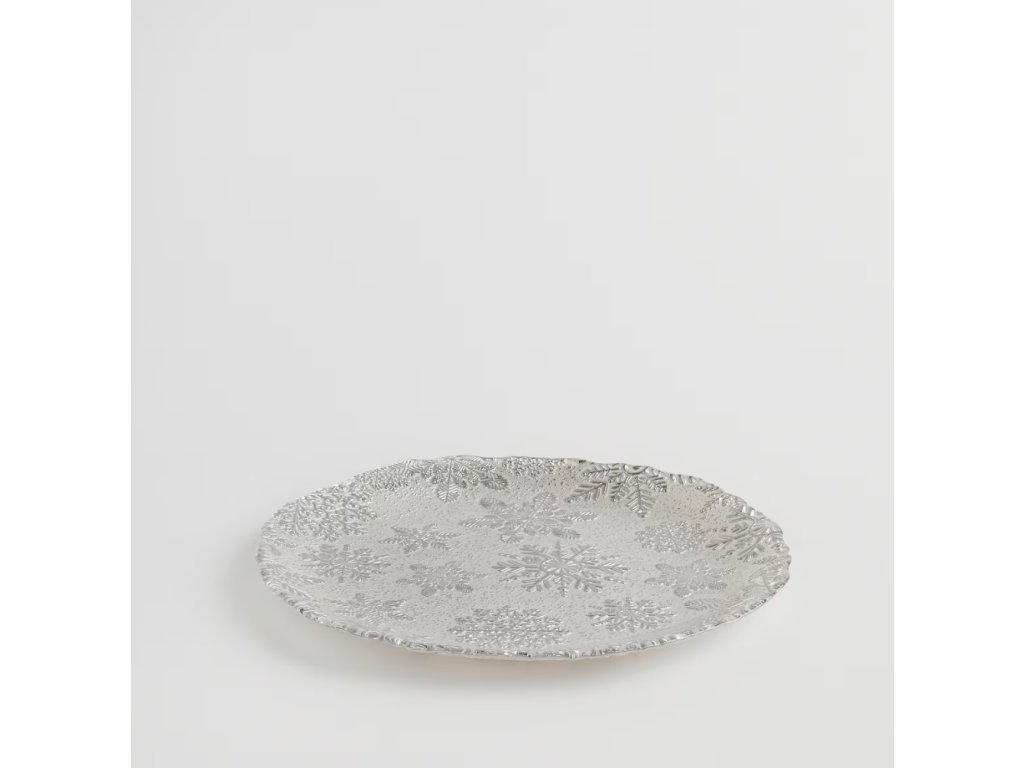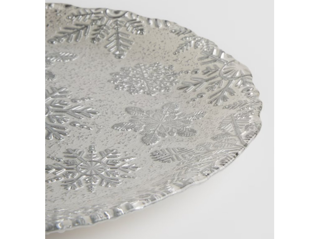 Vytvorte magickú atmosféru počas sviatočných stretnutí vďaka podnosu Snowflakes s priemerom 28 cm – výnimočný vzor a striebristý lesk, ktorý očarí Vašich hostí. Tento elegantný, ozdobný podnos sa hodí na servírovanie sladkostí, ako aj na vystavovanie dekorácií, vnášajúc do interiéru nádych zimného kúzla.