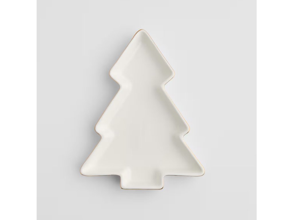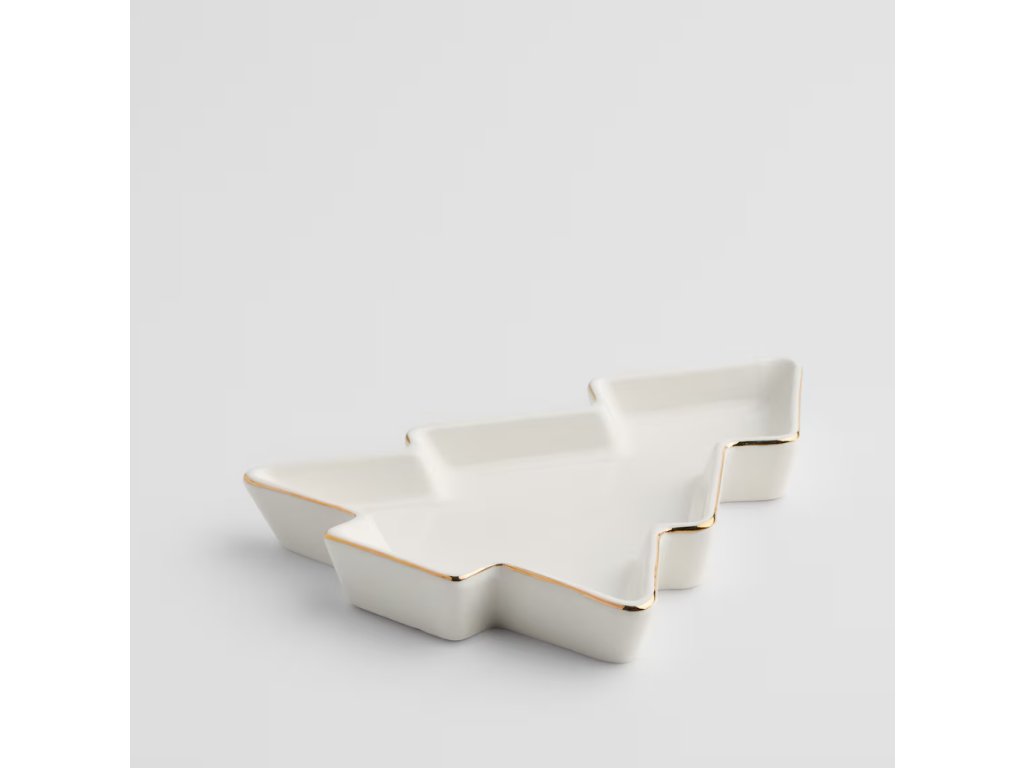 Biela tácka v tvare vianočného stromčeka so zlatým okrajom púta pozornosť minimalistickou formou a eleganciou. Lesklé vyhotovenie a starostlivé detaily z nej robia originálny dekoračný prvok do moderných, klasických a sviatočných aranžmánov. Ideálne sa hodí ako ozdoba stola počas Vianoc, ale aj ako štýlový darček pre blízku osobu.