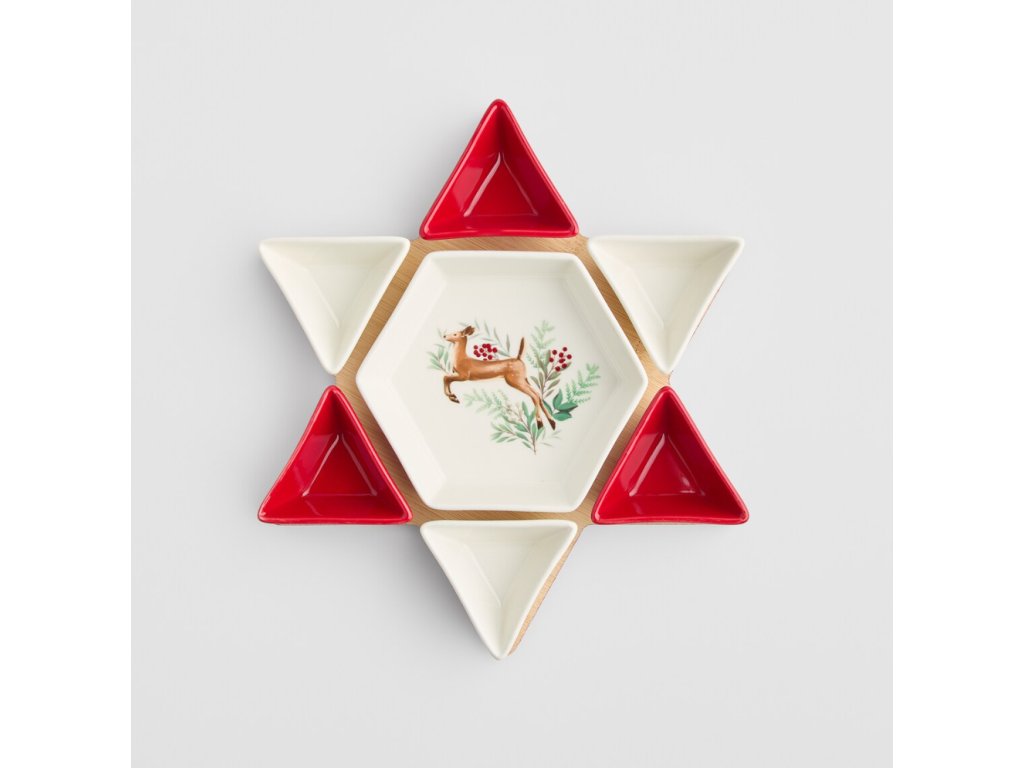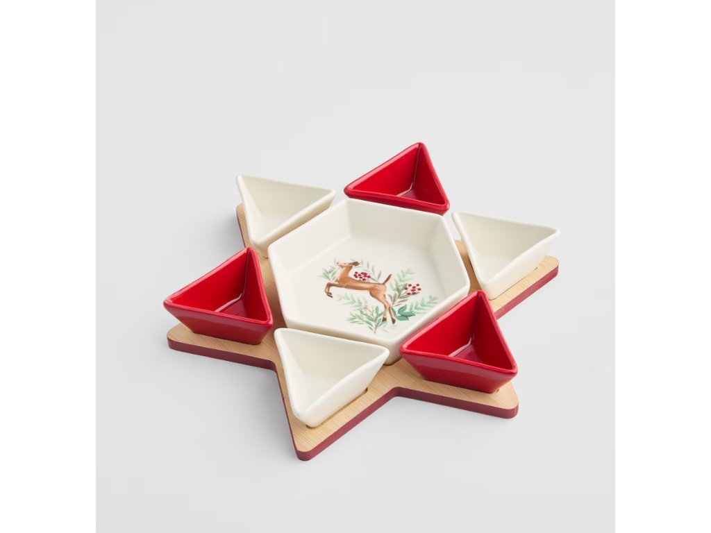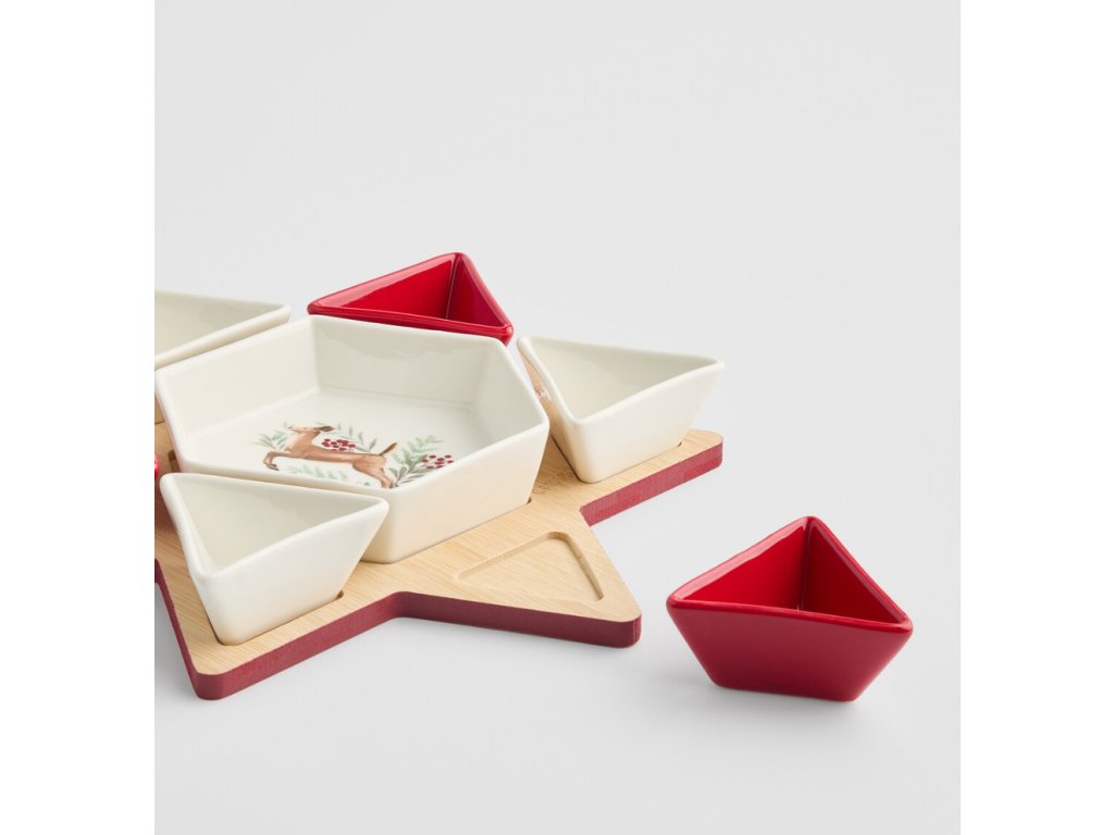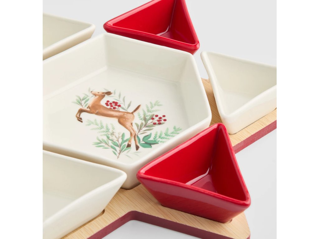Servírujte sviatočné dobroty s touto originálnou súpravou misiek. Súprava v tradičnom štýle pozostáva zo siedmich misiek z kameniny usporiadaných na bambusovom podnose v tvare hviezdy, s rozmermi 28 x 24,5 cm. Centrálna miska s motívom lesného zvieraťa a vianočnej čečiny je obklopená bielymi a sýto červenými miskami, čo vytvára dokonalú vianočnú dekoráciu stola. Je ideálna na servírovanie rôznych dipov, orieškov, olív alebo menších predkrmov. Upozornenie: Bambusový podnos nie je vhodný do umývačky riadu ani mikrovlnnej rúry.