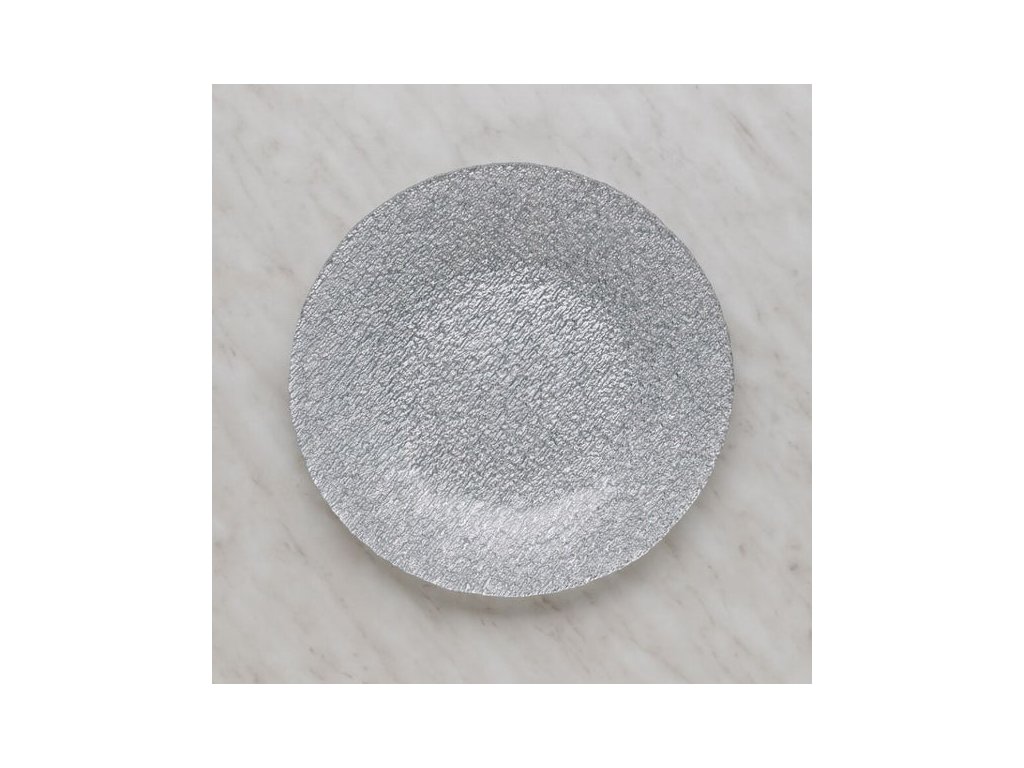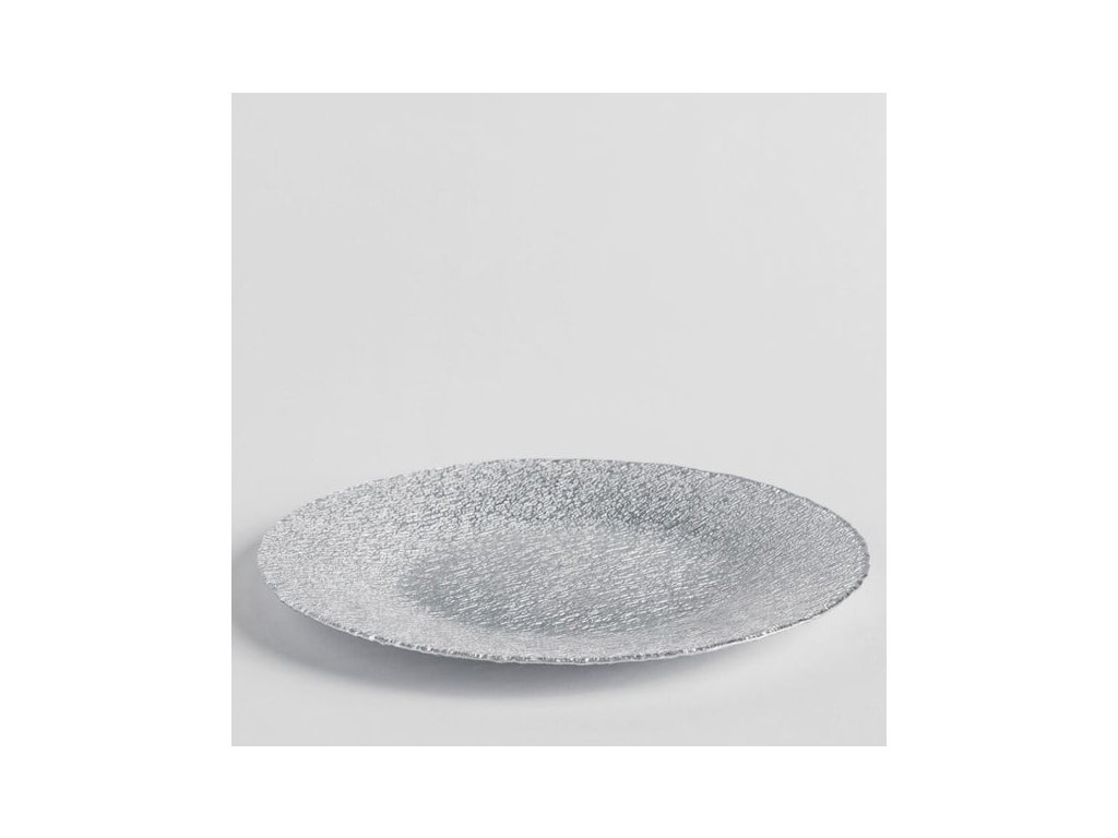 Elegantný servírovací tanier v striebornej farbe s výraznou textúrovanou povrchovou úpravou. Dodáva stolu moderný a sofistikovaný vzhľad, ideálny na prezentáciu pokrmov alebo ako štýlová dekorácia.