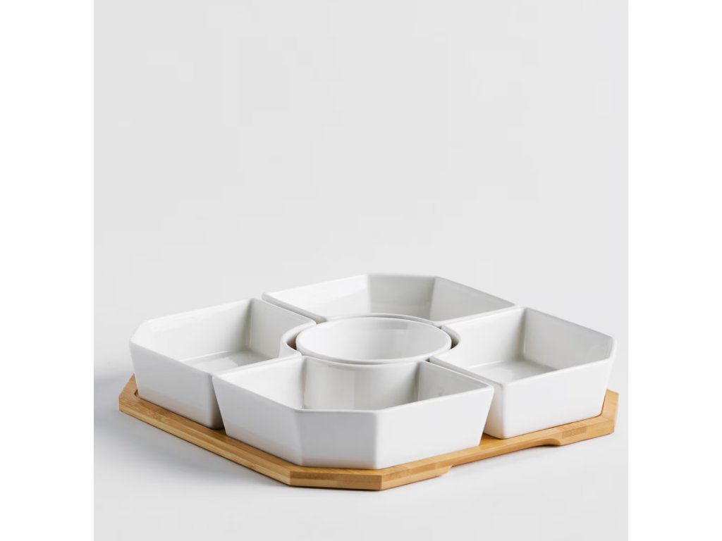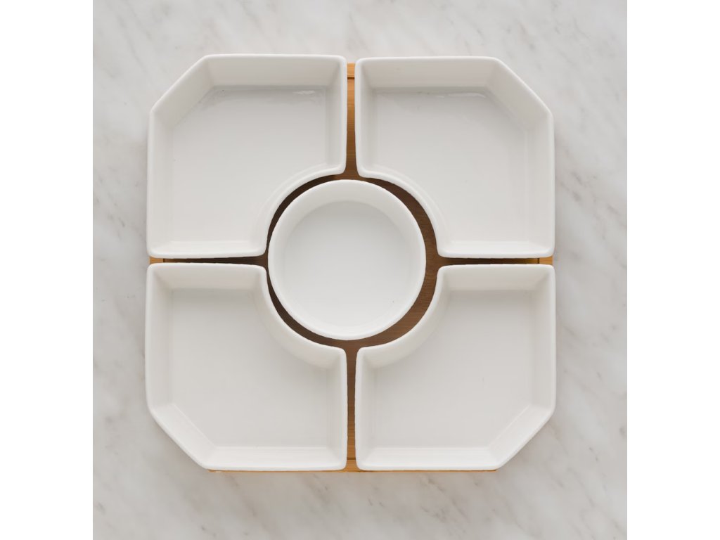 Quatrisa je súprava porcelánových misiek, ktoré sa osvedčia tak pri každodenných jedlách a podávaní zákuskov, ako aj ako prvok riadu pri špeciálnych príležitostiach na bohato prestretom stole. Súprava misiek sa skladá z 5 prvkov, z čoho v strede sa nachádza jedna okrúhla miska, obklopená štyrmi rohovými miskami. Môžete v nich podávať zákusky, ovocie a zeleninu, a v okrúhlej miske servírovať dip alebo nátierku. Skontrolujte tiež iné produkty z kategórie dekoratívne podnosy.