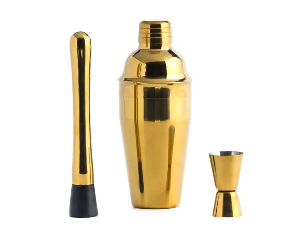 Luxusná zlatá barová súprava, ktorá obsahuje všetko potrebné pre prípravu dokonalých koktailov – šejker, madler a džiger. Ideálny doplnok pre každého domáceho barmana, ktorý ocení štýl a funkčnosť.