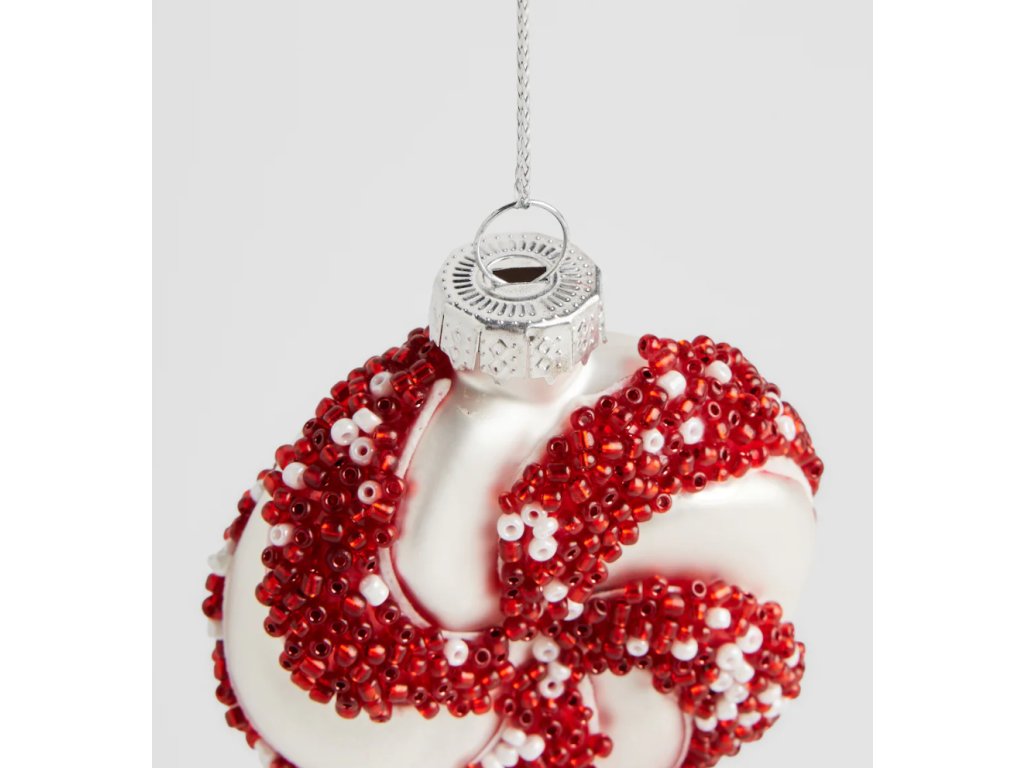 Lízatko: Okrúhla ozdoba s červeno-bielou špirálou, bohato posiata červenými trblietkami a korálikmi a ozdobená saténovou mašľou.