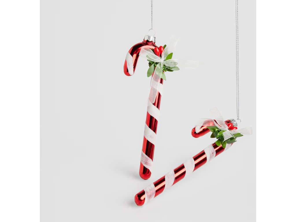 Veľká Cukrová Palica: Lesklá červeno-biela sklenená palica (candy cane), dekorovaná jemnou bielou stuhou a zelenými vetvičkami.