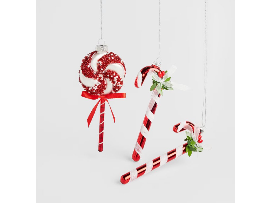 Súprava obsahuje tri lesklé ozdoby inšpirované tradičnými vianočnými cukrovinkami: