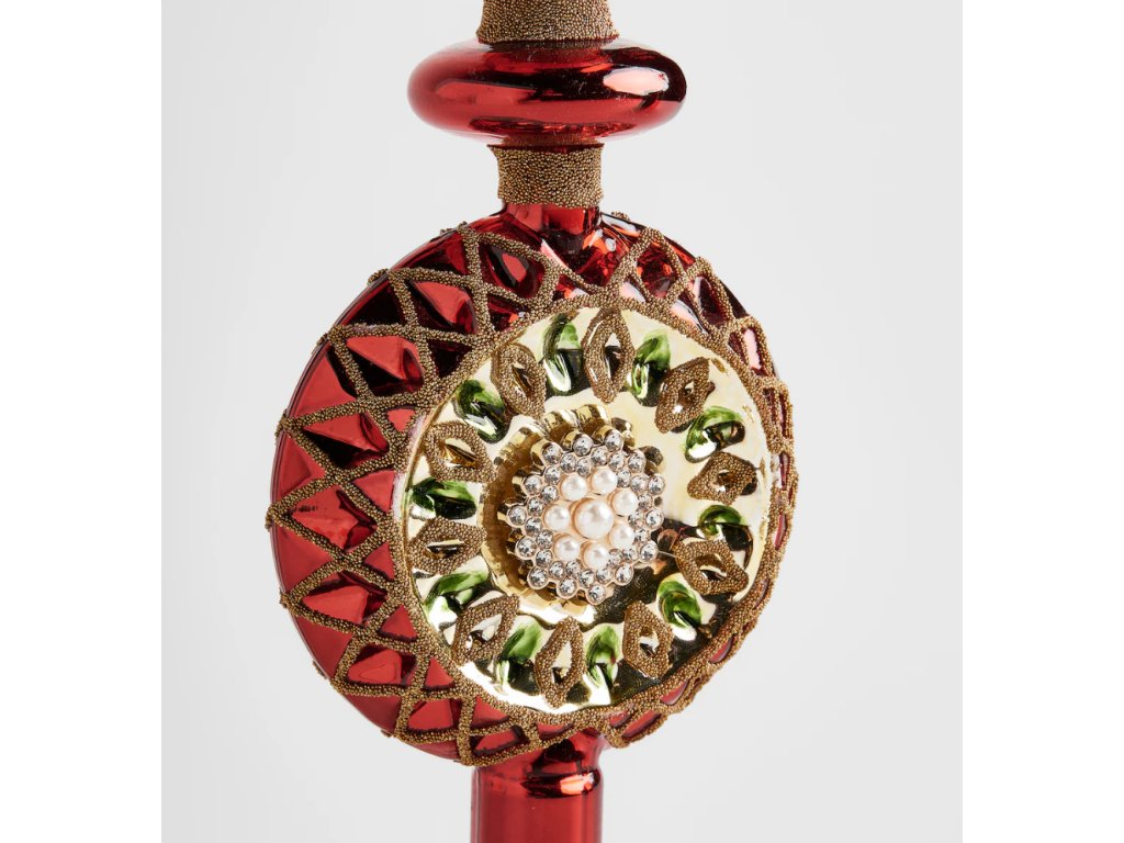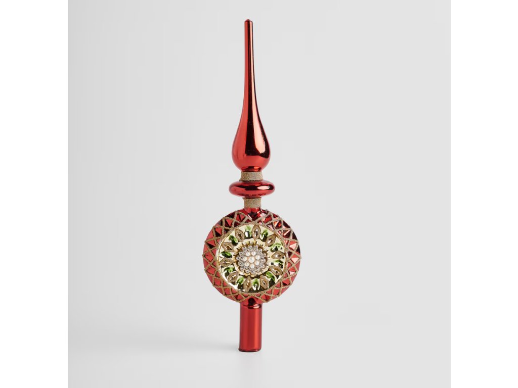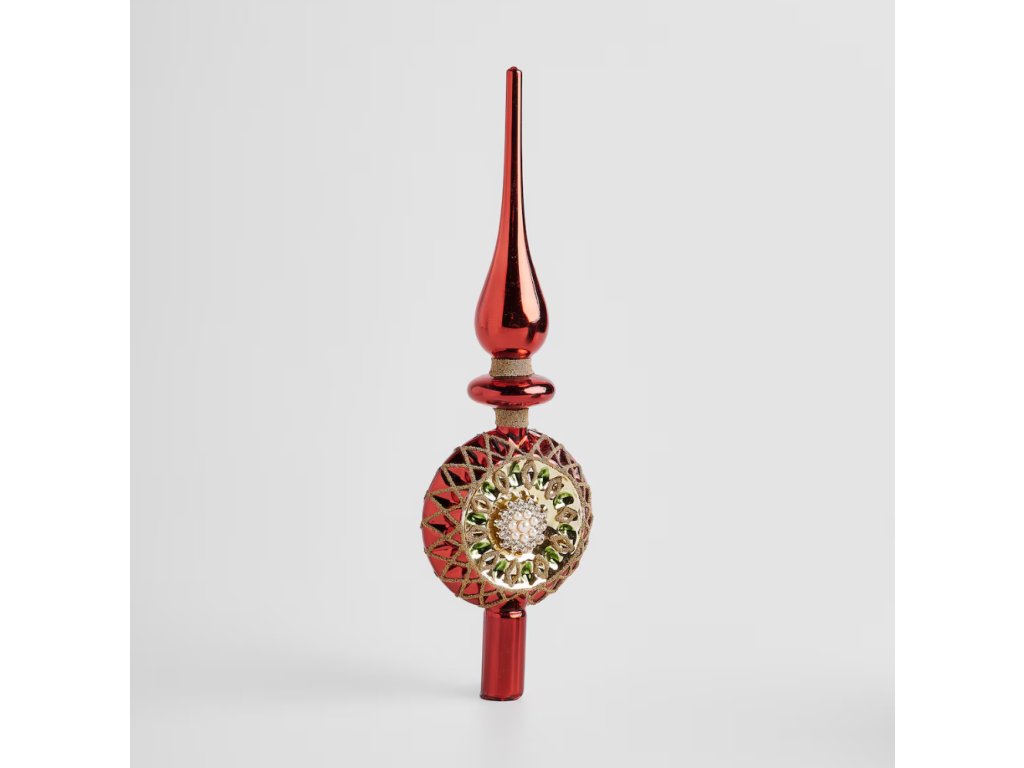 Korunujte svoj vianočný stromček špičkou Sitter! Táto sklenená ozdoba spája klasické vianočné farby – sýtu červenú, žiarivú zlatú a sýtu smaragdovo zelenú. Precízne zdobenie a tradičný tvar priťahujú pohľady a vytvárajú magický sviatočný dojem. Pre milovníkov vianočnej klasiky.