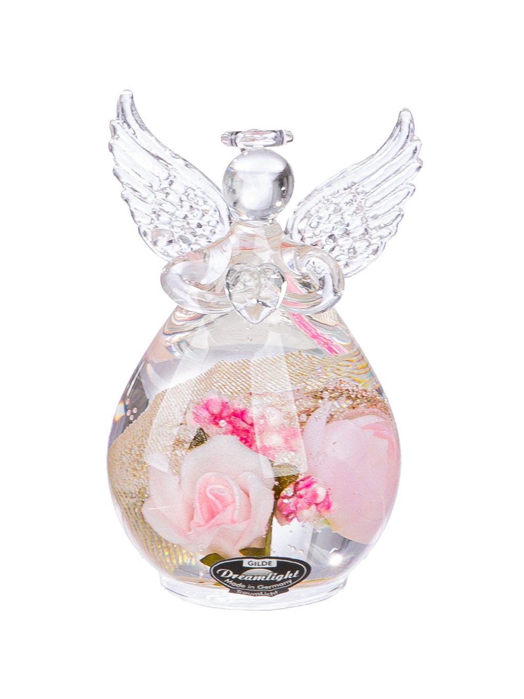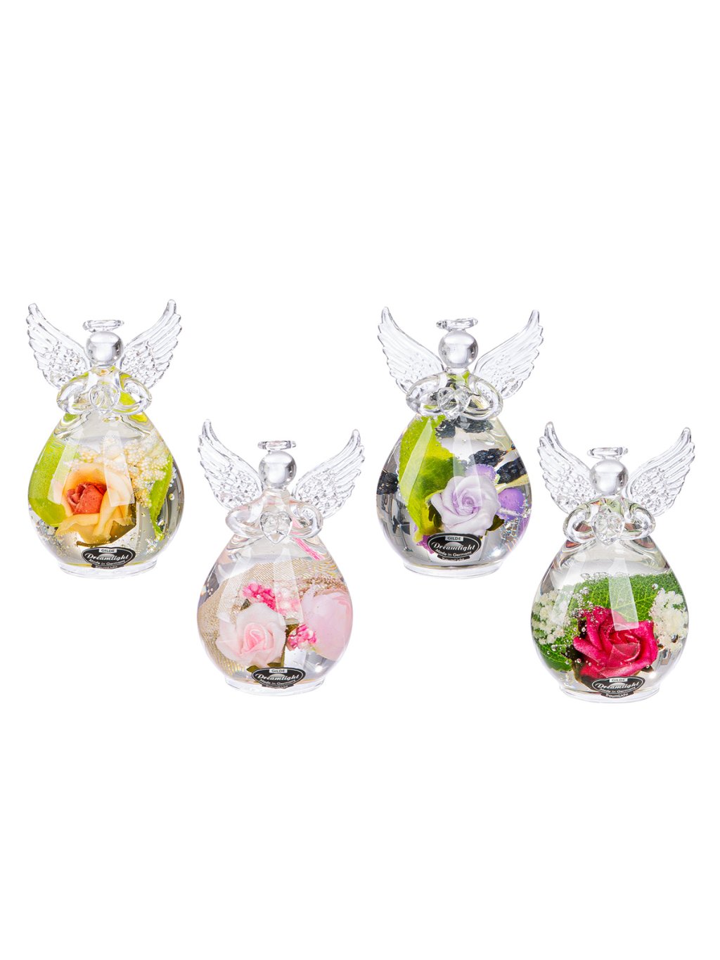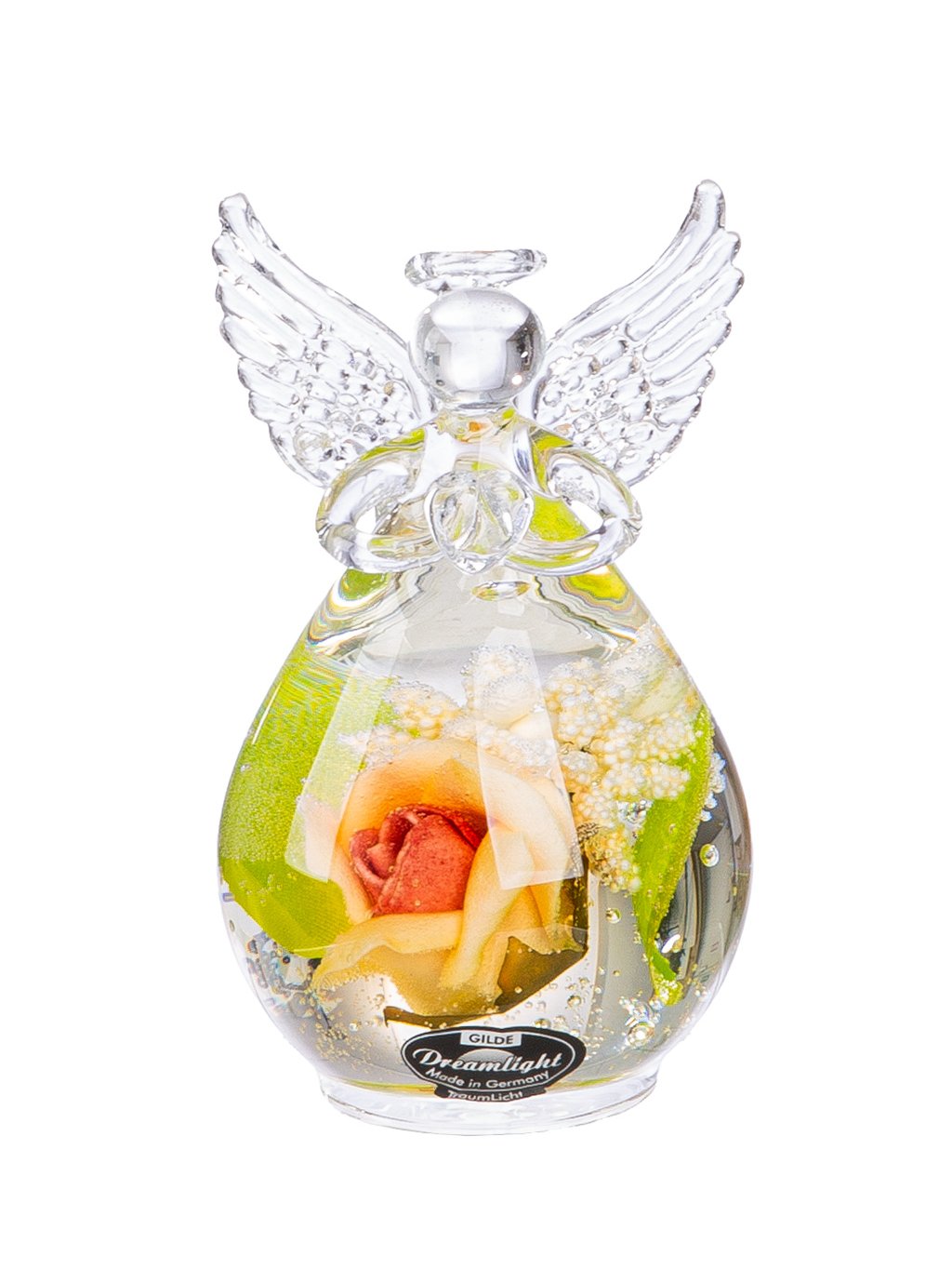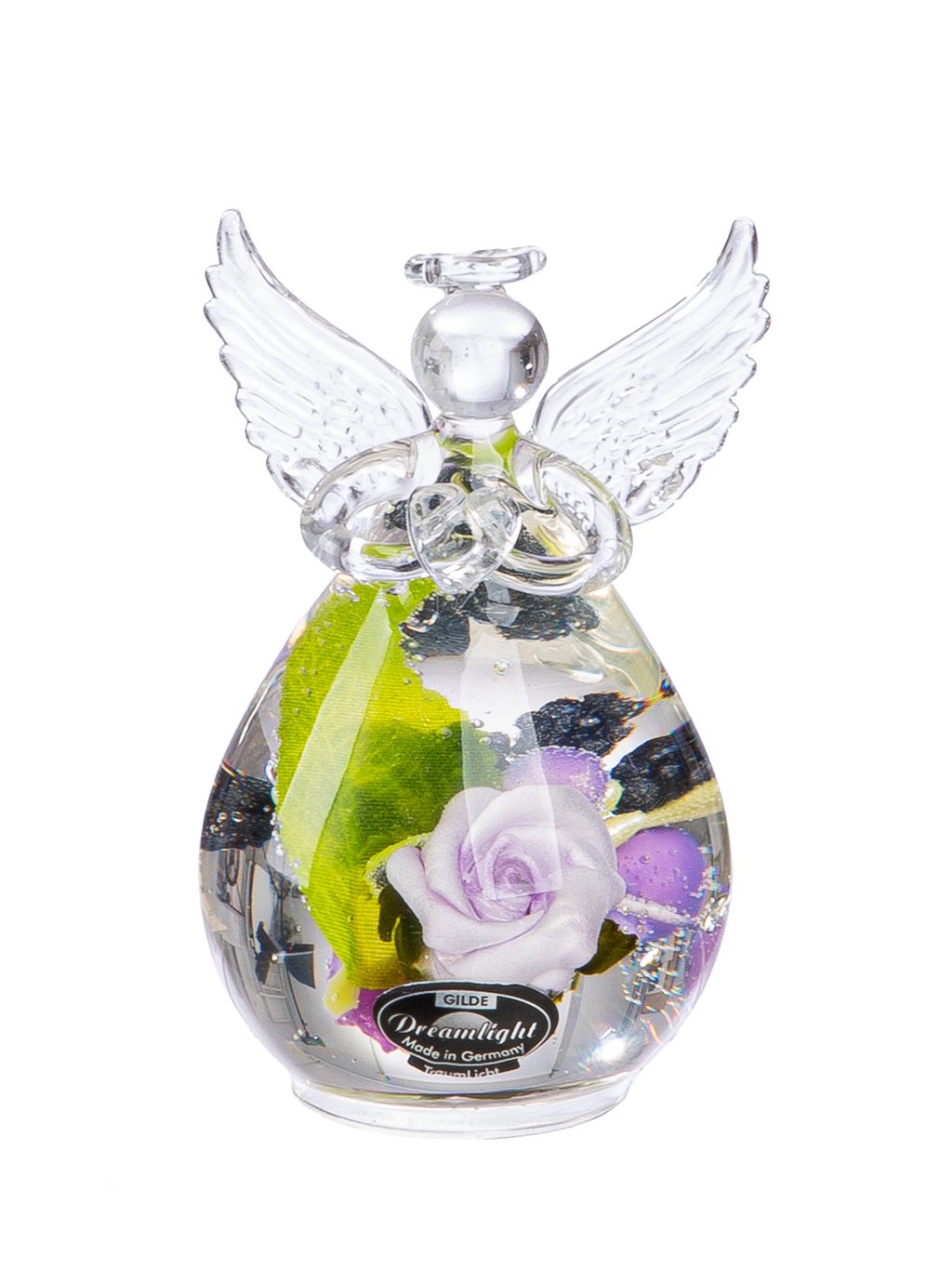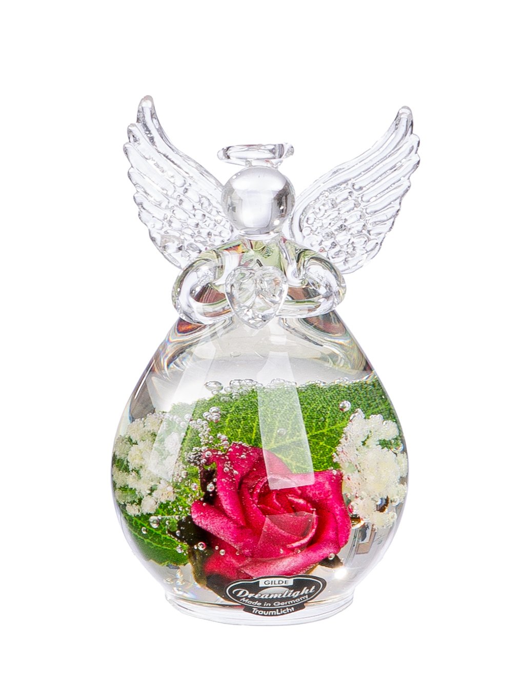 Tento vkusný sklenený anjel v sebe spája čistotu číreho skla a krásu prírody. V spodnej časti figúrky sú v špeciálnom géle zaliate skutočné konzervované kvety a zeleň, ktoré si zachovávajú svoju farbu a prirodzený vzhľad.