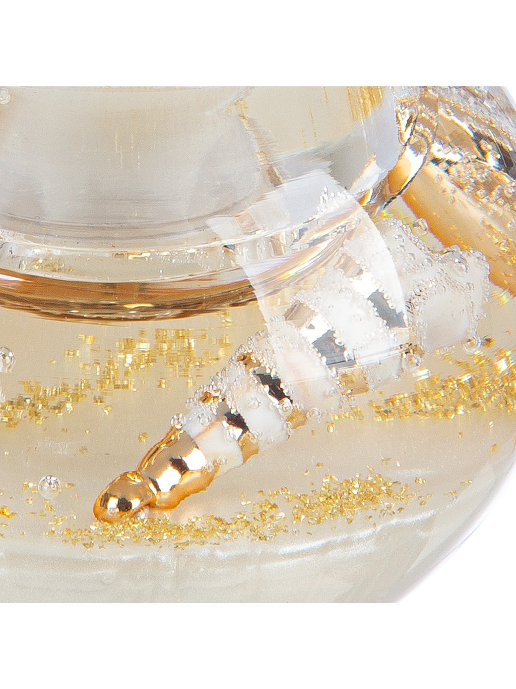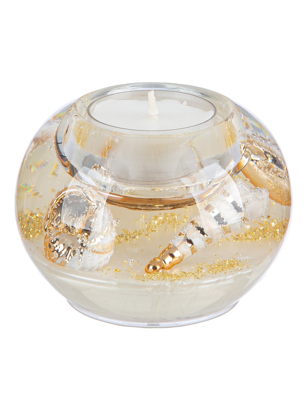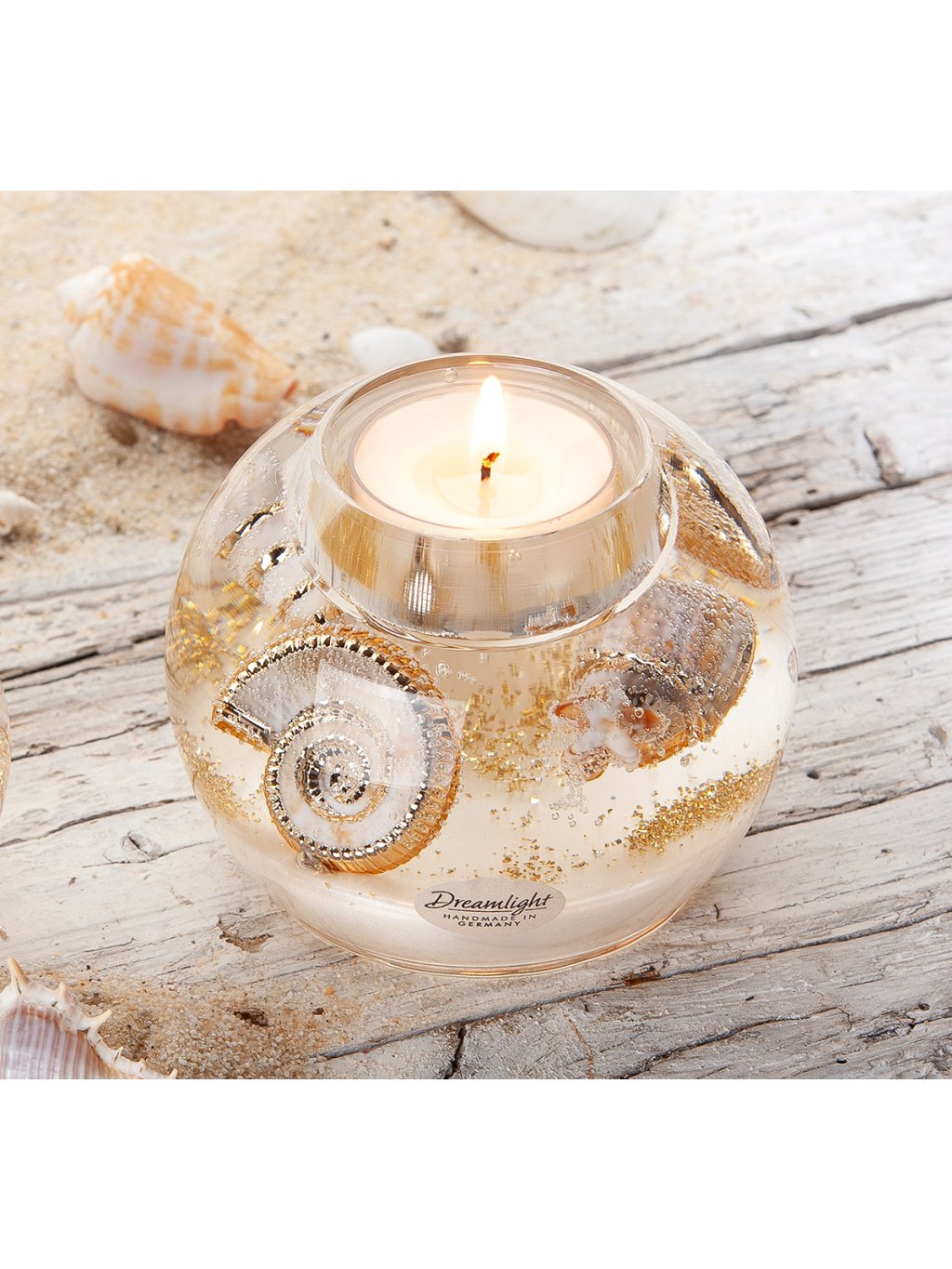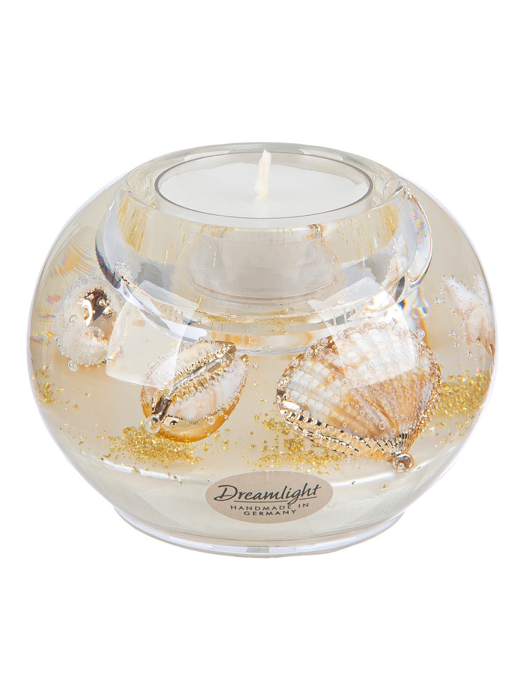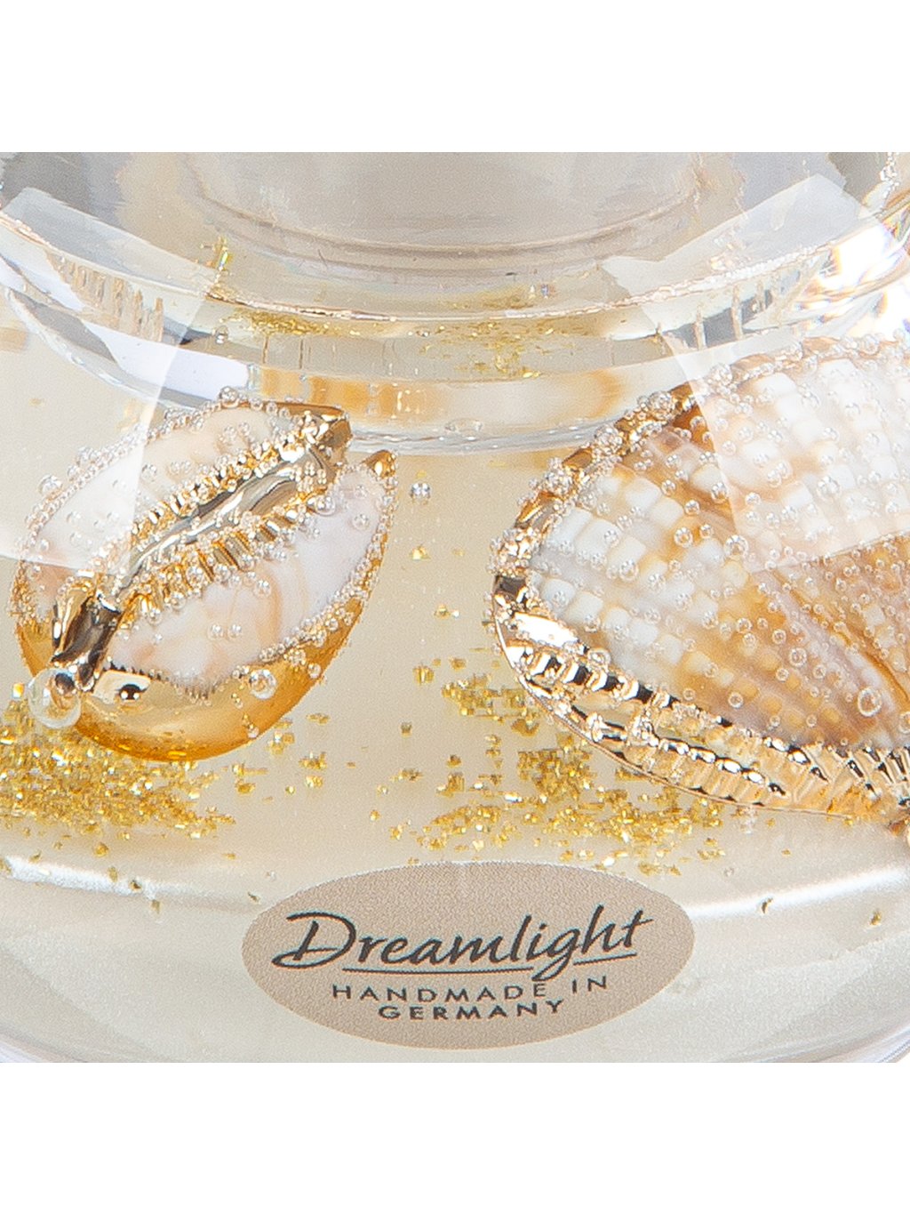Luxusný, ručne vyrobený svietnik z Nemecka, ktorý kombinuje číre sklo, jemné mušle a zlatisté odlesky. Ideálny doplnok pre milovníkov elegancie a prímorskej atmosféry.