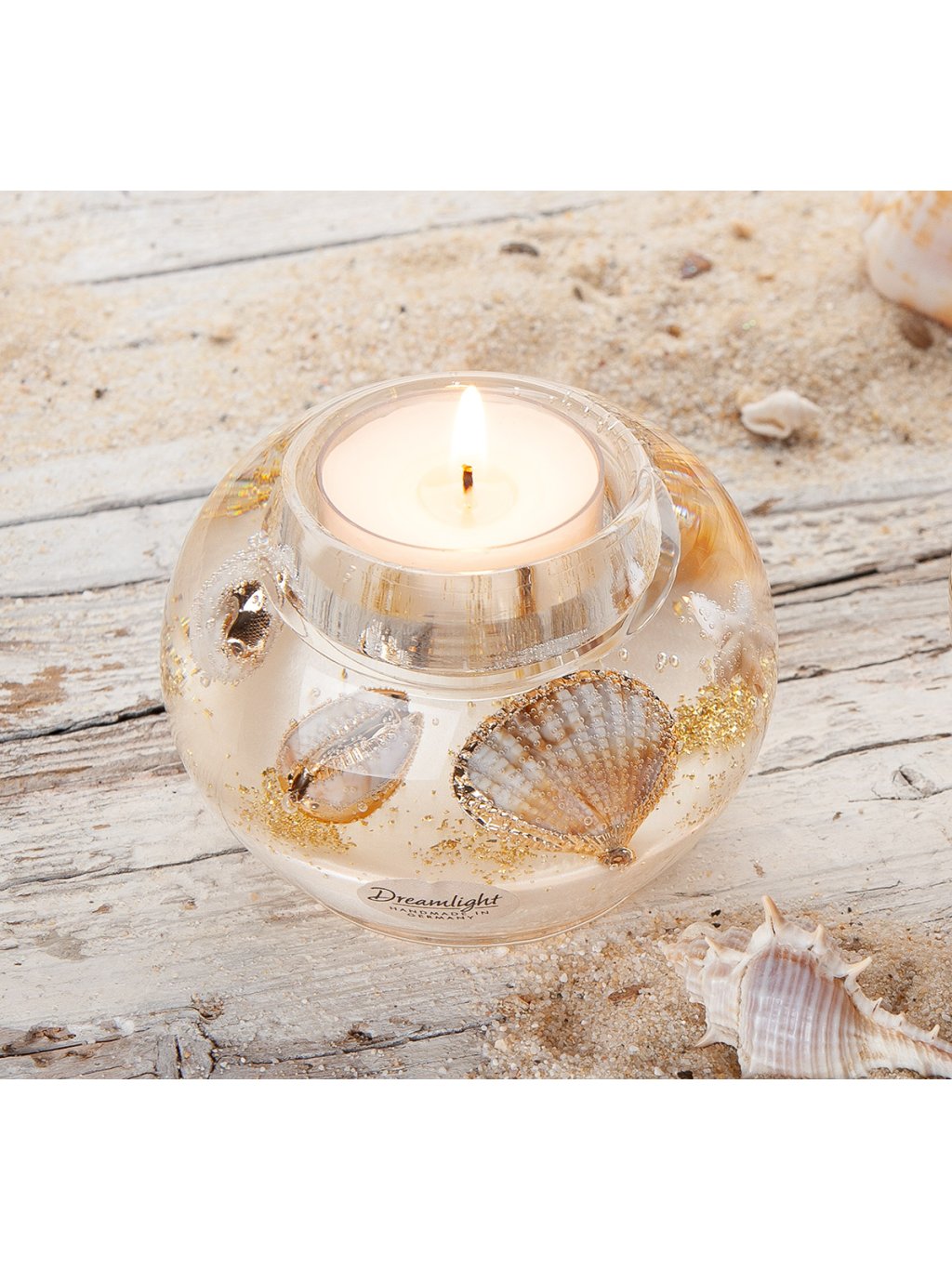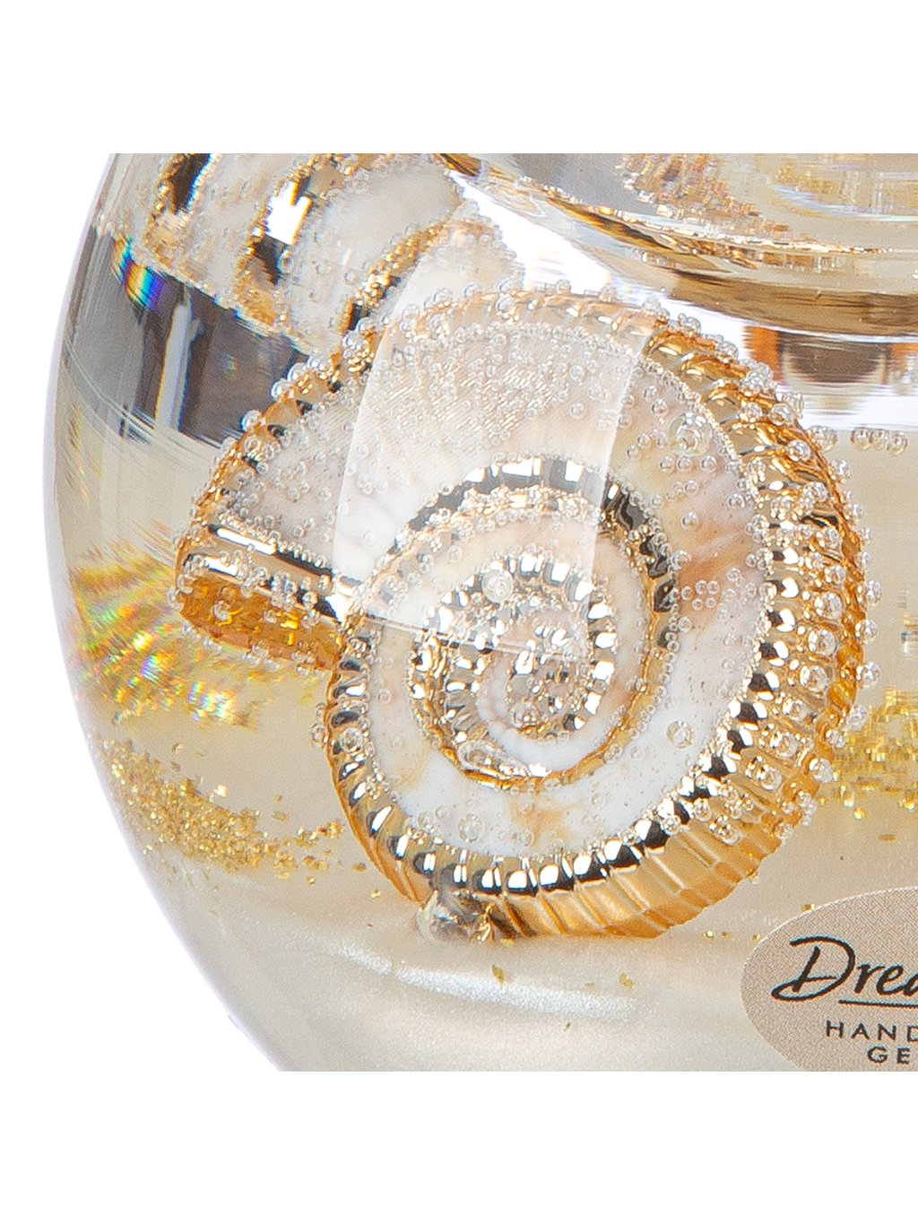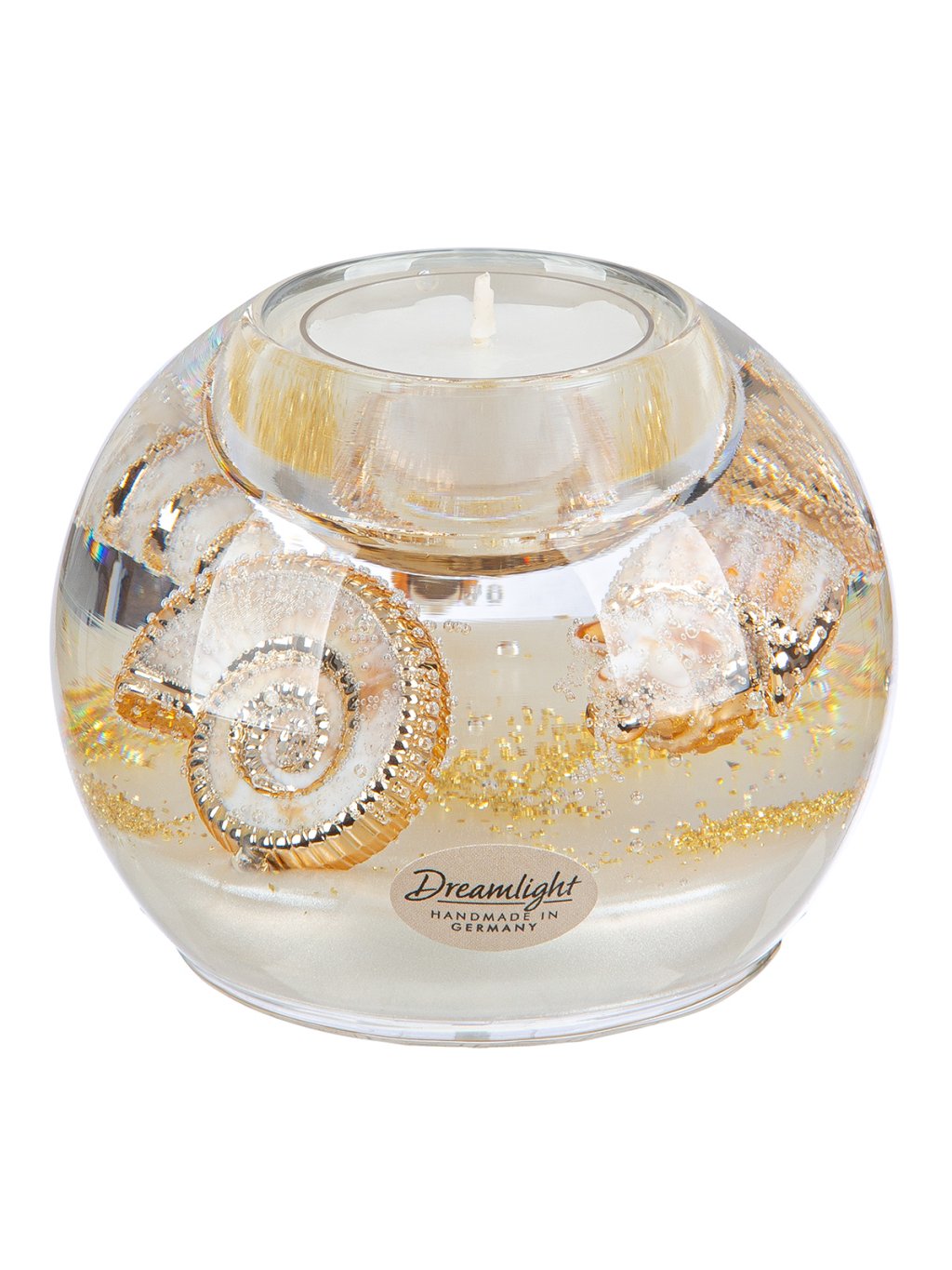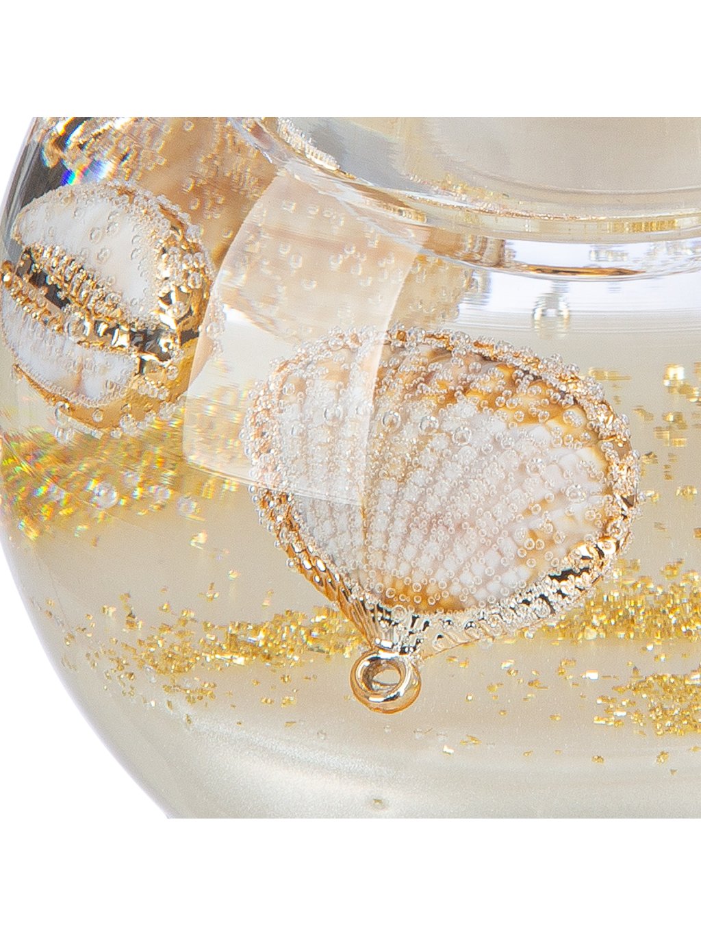 Luxusný, ručne vyrobený svietnik z Nemecka, ktorý kombinuje číre sklo, jemné mušle a zlatisté odlesky. Ideálny doplnok pre milovníkov elegancie a prímorskej atmosféry.