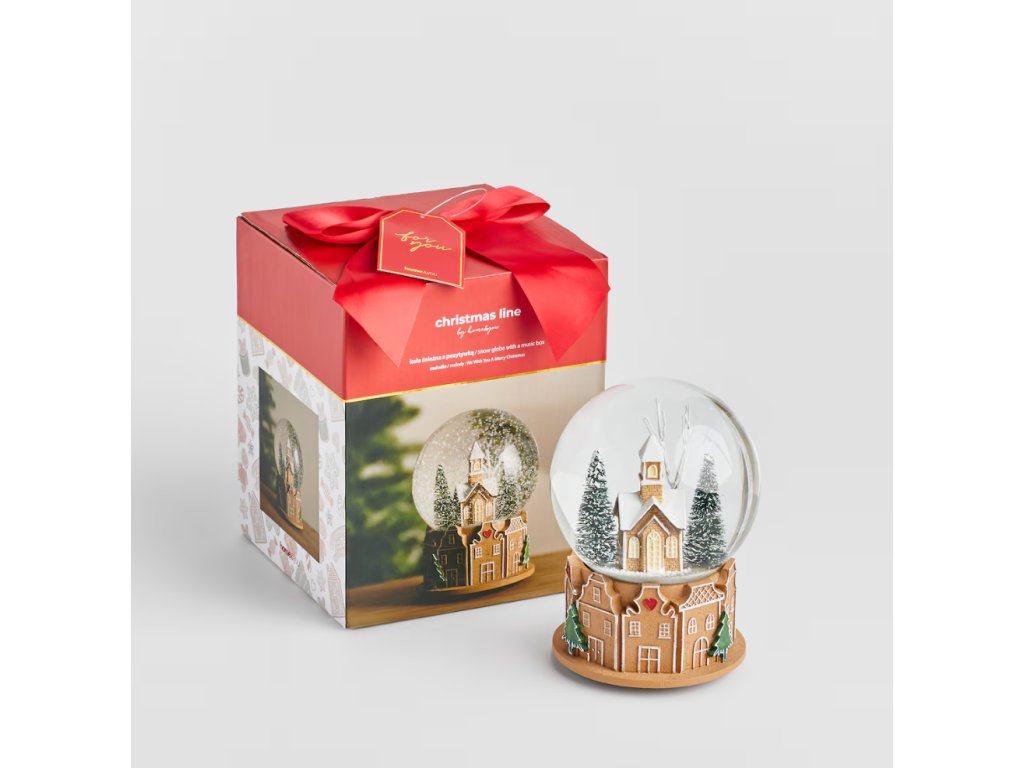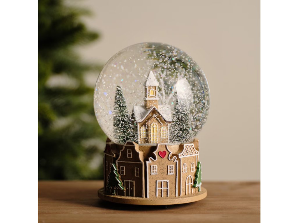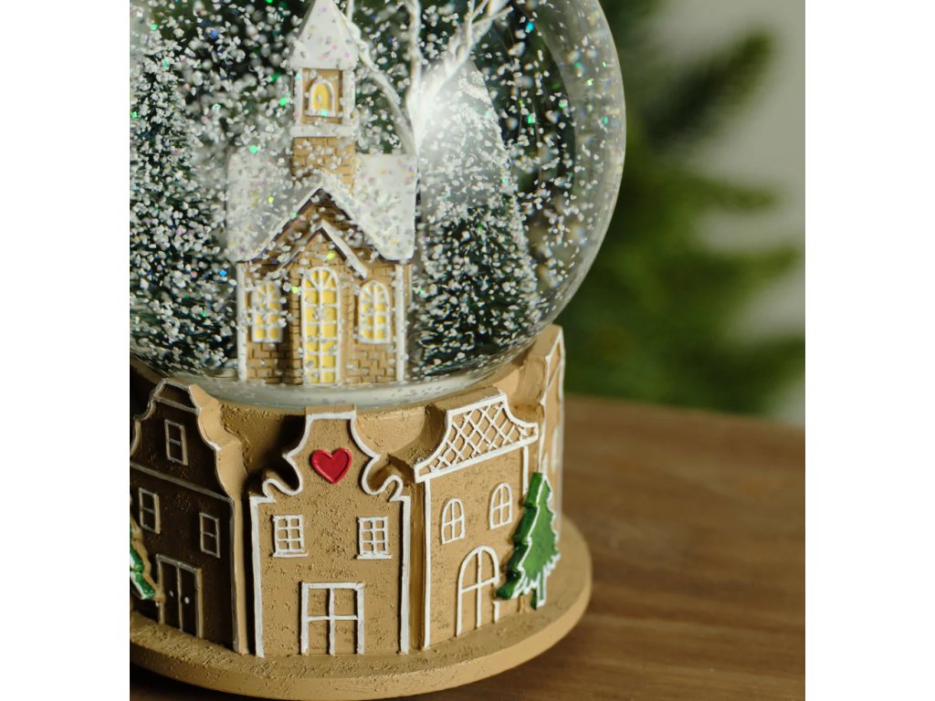 Preneste sa do rozprávkového vianočného sveta s hnedou snehovou guľou Roti s hracím strojčekom. Sklenený glóbus ukrýva idylickú zasneženú scénu: malý kostolík obklopený borovicami, ktorý sa vznáša v trblietavom snežení. Najväčšie čaro dodáva figúrke jej podstava, ktorá je vyrobená zo živicovej hmoty a detailne spracovaná ako rad tradičných perníkových domčekov. S výškou 17 cm a príjemným hracím strojčekom je tento glóbus ideálnou dekoráciou pre navodenie teplej, tradičnej sviatočnej atmosféry, ktorá poteší deti aj dospelých.
