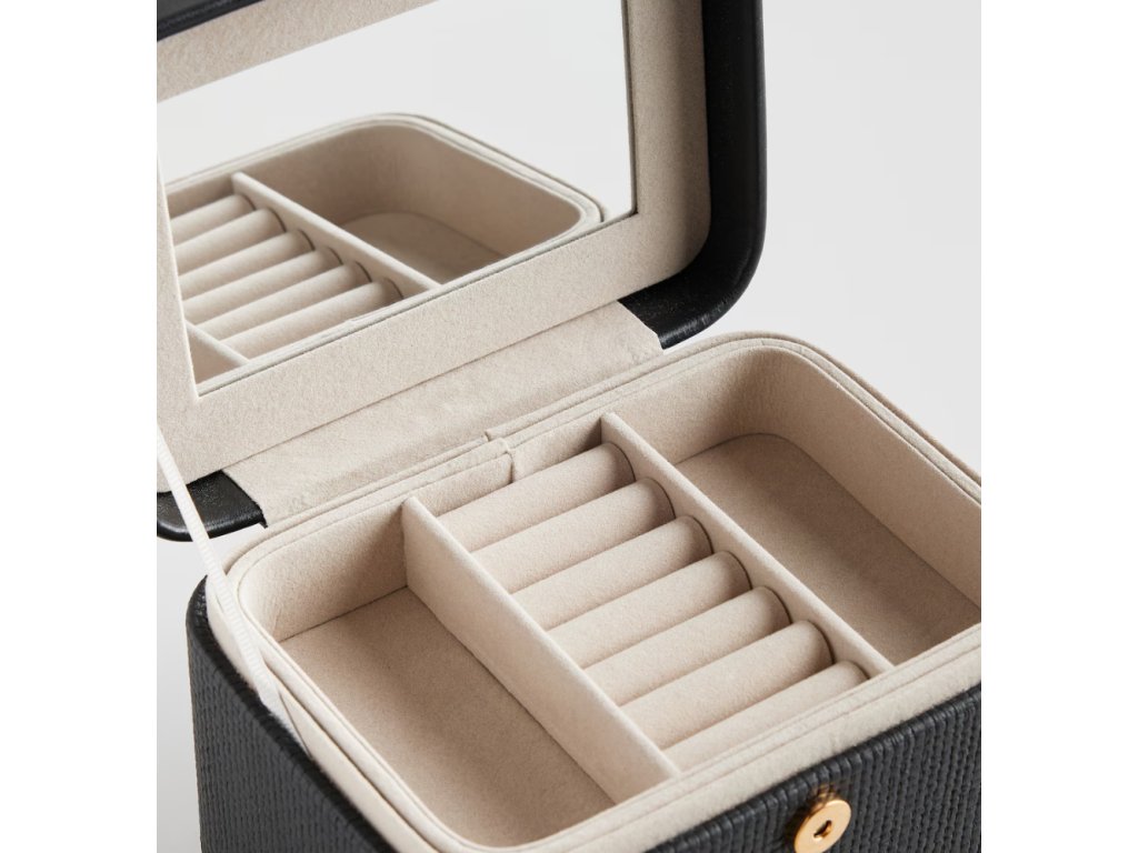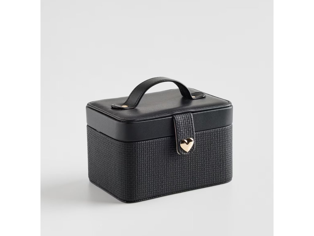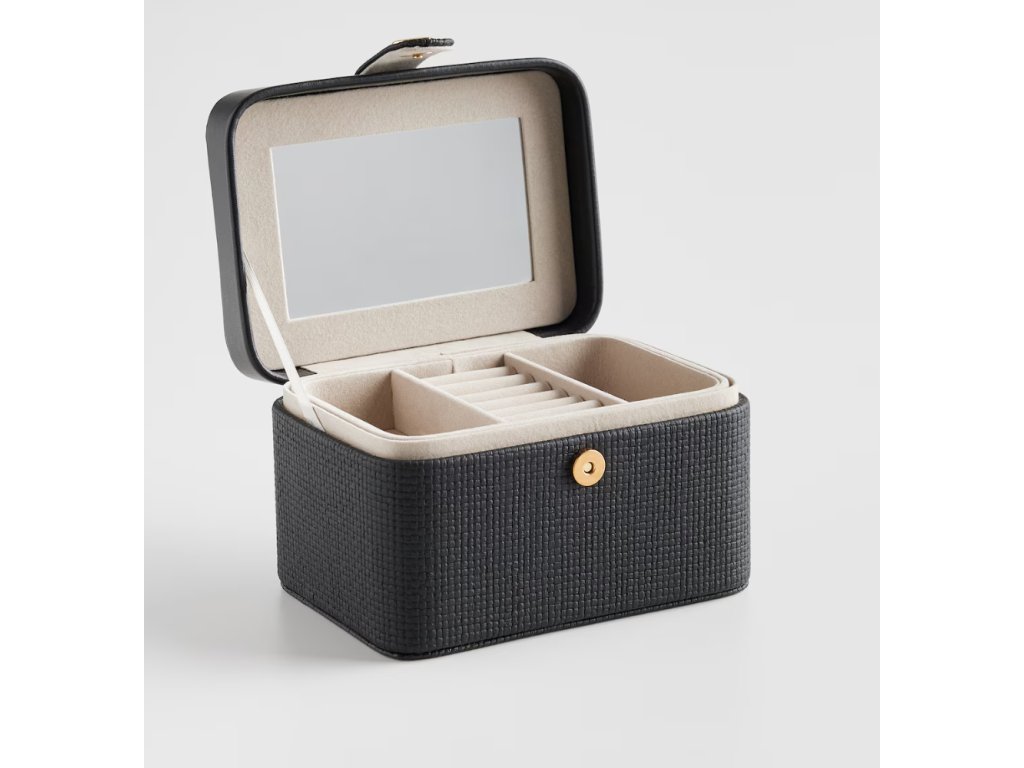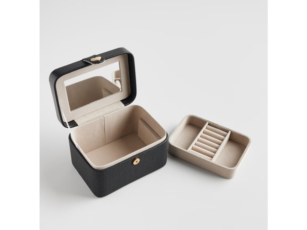 Šperkovnica v čiernej farbe je elegantná a moderná možnosť na uchovávanie cenných drobností. Jej minimalistický dizajn v klasickej čiernej farbe sa dokonale hodí do každého interiéru, dodávajúc mu šarm a rafinovanosť. Je ideálna na uchovávanie šperkov, hodiniek alebo iných malých pokladov, spája jednoduchosť s funkčnosťou.