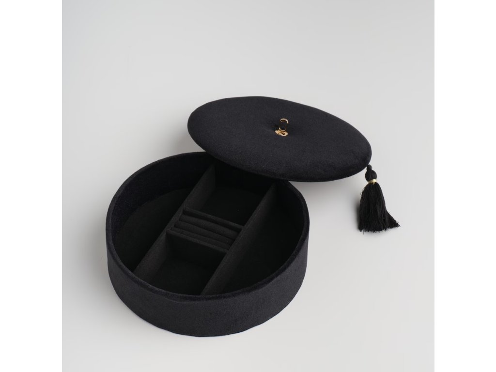 Škatuľka v elegantnej čiernej farbe, s priemerom a výškou . Jej moderný dizajn a štýlové vyhotovenie ju predurčujú na ideálne uskladnenie šperkov. Ľahká, a zároveň odolná konštrukcia z nej robí praktický a estetický doplnok do spálne či na toaletný stolík, ktorý vnesie do interiéru nádych elegancie a poriadku.