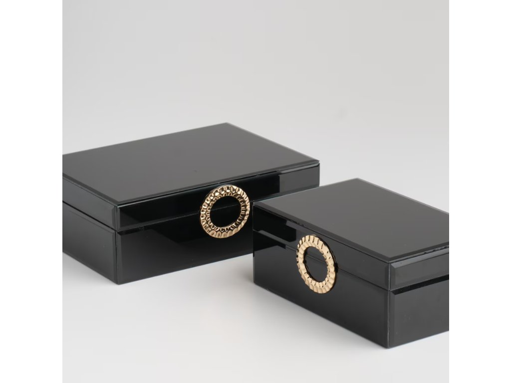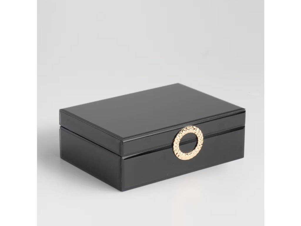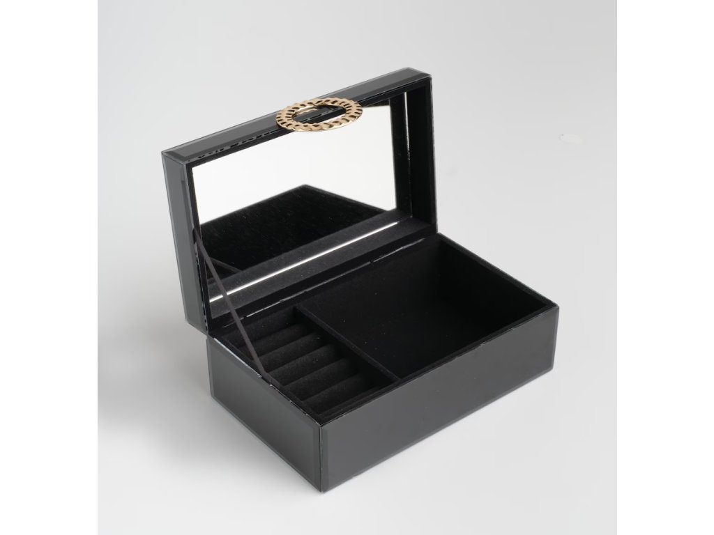 Elegantná šperkovnica vyrobená zo skla v hlbokej čiernej farbe. Jej minimalistický dizajn a moderný vzhľad ju robia dokonale zapadajúcou do rôznych štýlov aranžovania interiérov. Je ideálna na uchovávanie šperkov, drobností či iných cenných predmetov, zaisťuje im nielen bezpečnosť, ale aj štýlové miesto. Je to dokonalá voľba tak ako praktický prvok vybavenia, ako aj dekoračný akcent, ktorý vnesie šarm do každého priestoru.