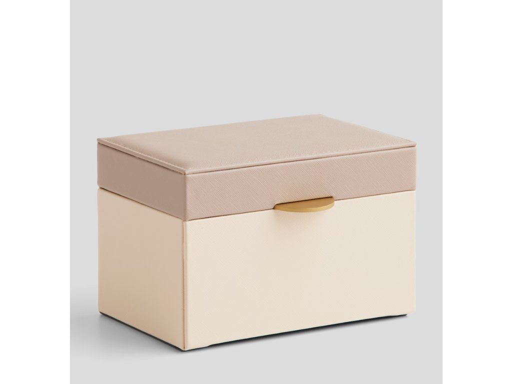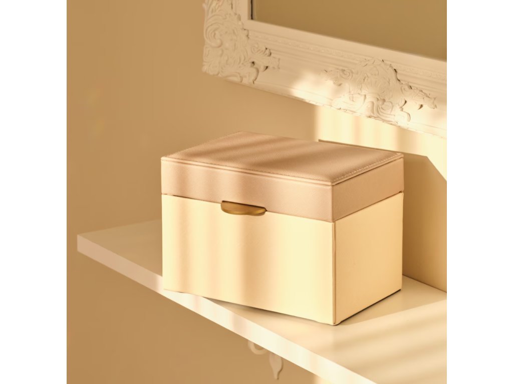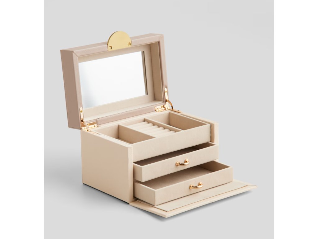 Štýlová šperkovnica vyrobená z polyuretánu v elegantnej tmavobežovej farbe. Jej decentná forma a trvácny materiál zaisťujú bezpečné uschovanie šperkov a zároveň dodávajú interiéru triedu. Ideálna na uskladnenie prsteňov, náhrdelníkov či náramkov, predstavuje funkčný a estetický prvok každého toaletného stolíka alebo komody.