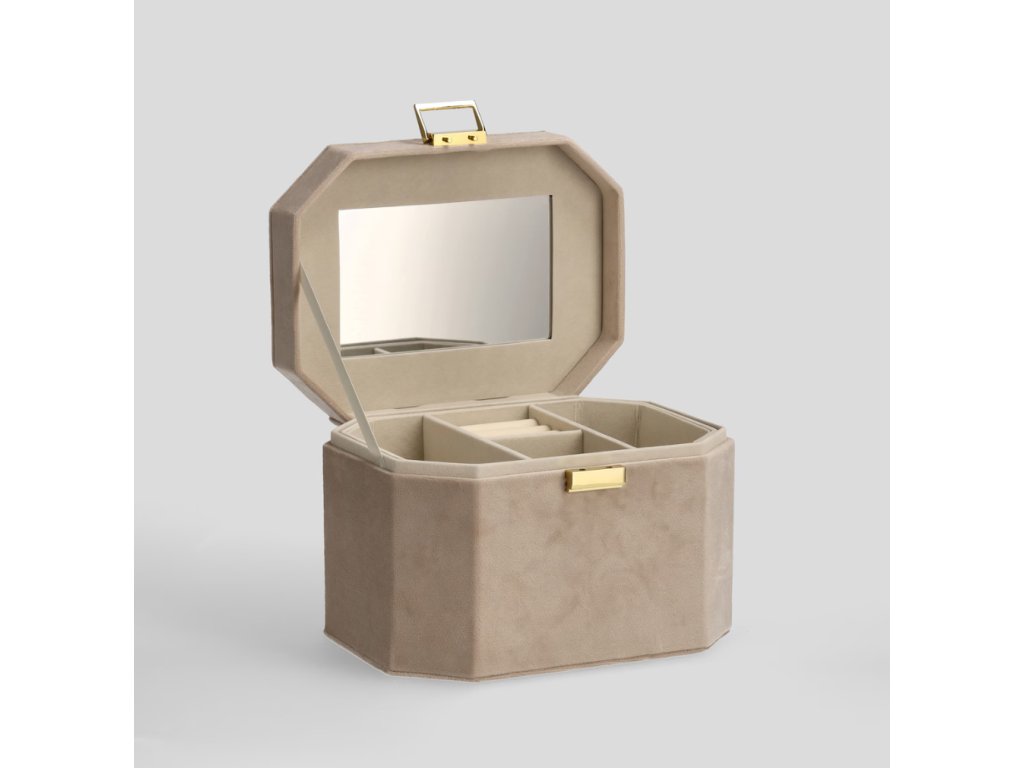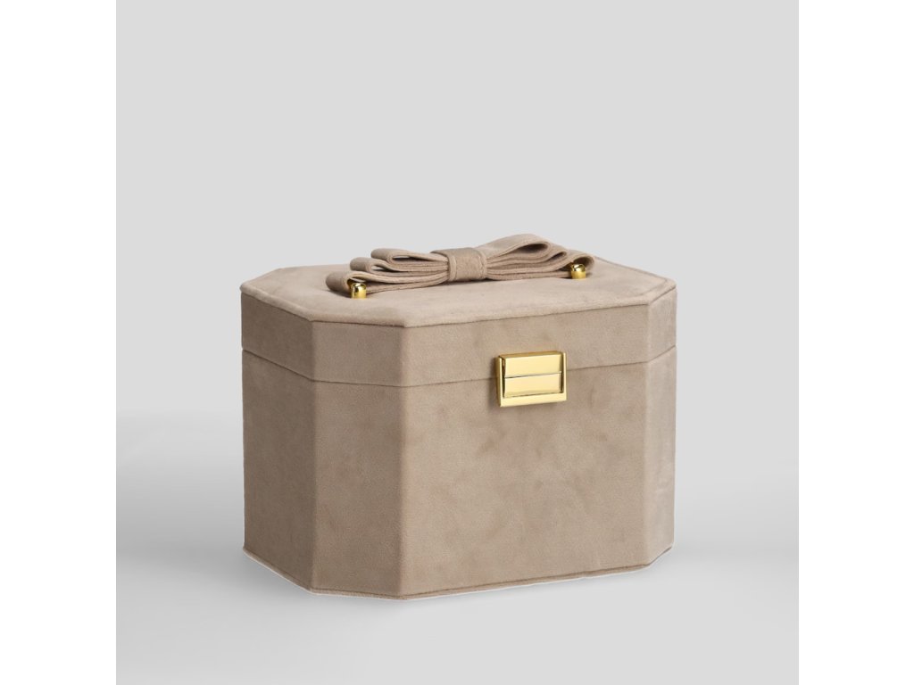 Elegantná šperkovnica v béžovej farbe, vyrobená z materiálu MDF a polyesteru. Štýlový a praktický doplnok, ktorý zaisťuje bezpečné uskladnenie cenností, zároveň predstavuje dekoračný prvok interiéru.