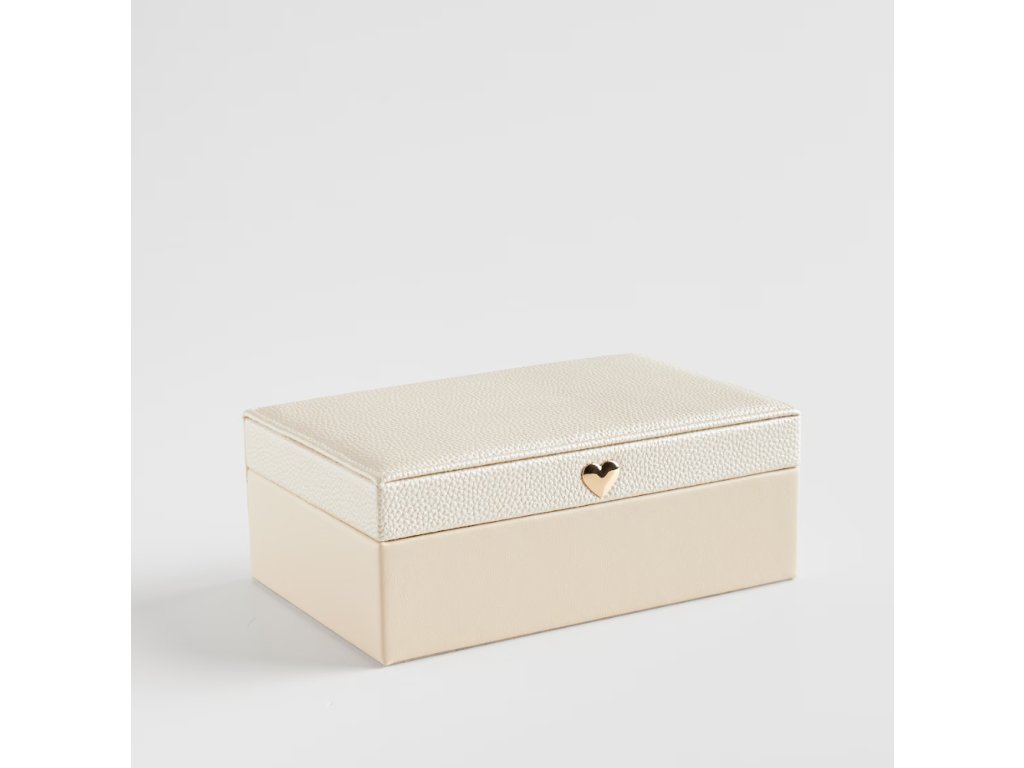 Šperkovnica v svetlobéžovej farbe je elegantná a nadčasová ozdoba, ideálna na uskladnenie cenných drobností. Jej tlmená farba a jednoduchý dizajn ju robia vhodnou do rôznych interiérov, vnášajúc do priestoru jemnú eleganciu. Je dokonalá na uchovávanie šperkov, hodiniek či iných malých pokladov, spája funkčnosť s estetikou.