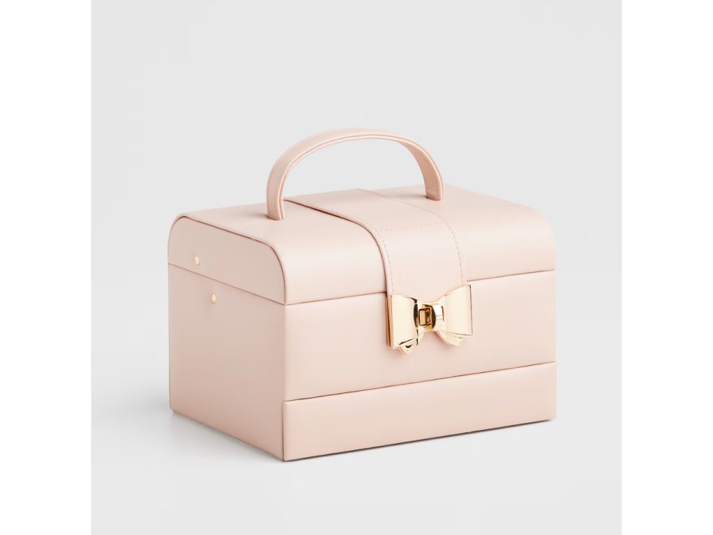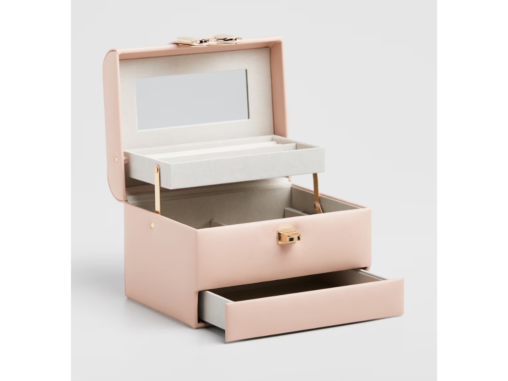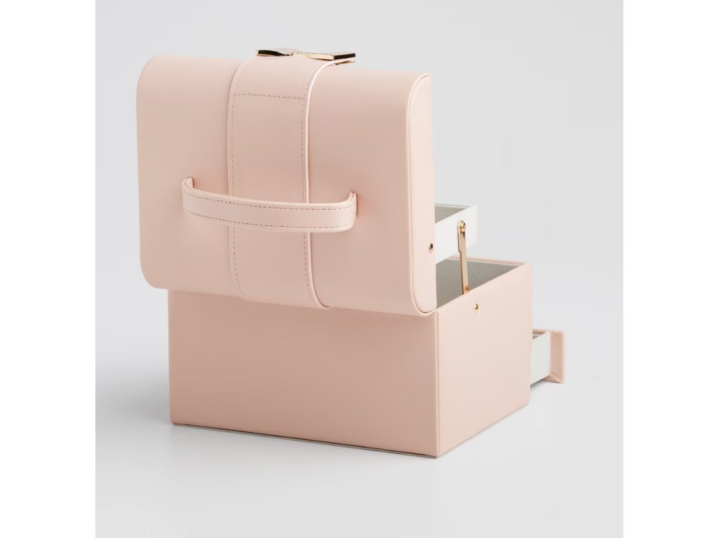 Šperkovnica z materiálu PVC, kovu a plastu v svetloružovej farbe je elegantná a praktická možnosť na uchovávanie cenných drobností. Jej subtílna farba a starostlivo vybrané materiály jej dodávajú moderný, a zároveň jemný charakter. Je ideálna na uchovávanie šperkov, kozmetiky alebo iných drobných pokladov, spája funkčnosť s estetikou.