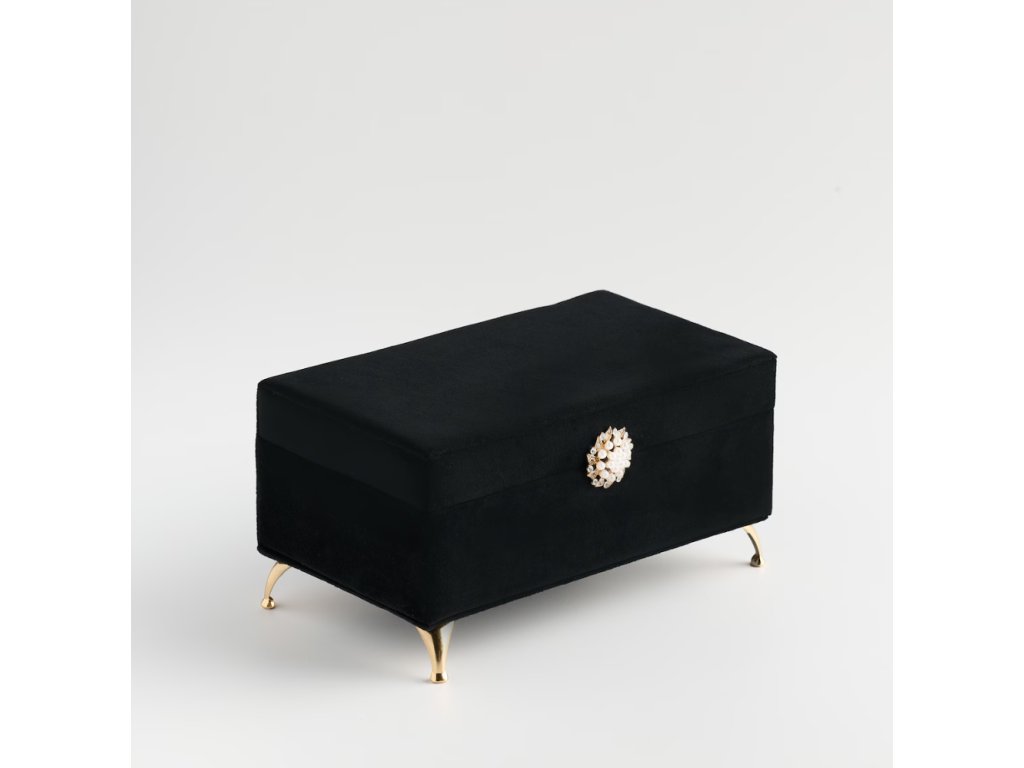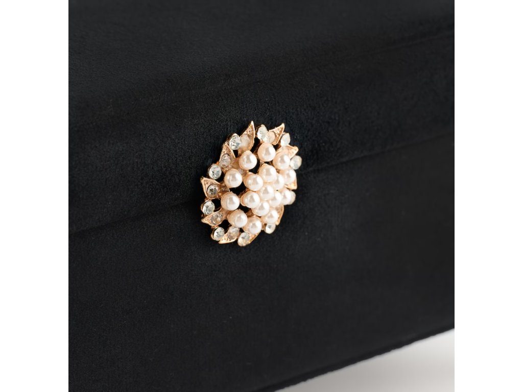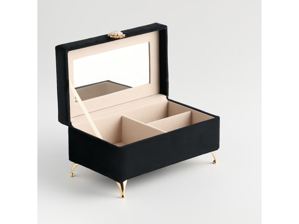 Elegantná šperkovnica vyrobená z mäkkého zamatu (velúru) s prímesou materiálu MDF, v čiernej farbe, s rozmermi 11 cm x 14 cm x 21,5cm. Je ideálna na uskladnenie šperkov a drobných doplnkov, spája v sebe luxusný vzhľad s funkčnosťou. Jej kompaktná veľkosť a rafinované vyhotovenie z nej robia štýlový doplnok na toaletný stolík alebo komodu.
