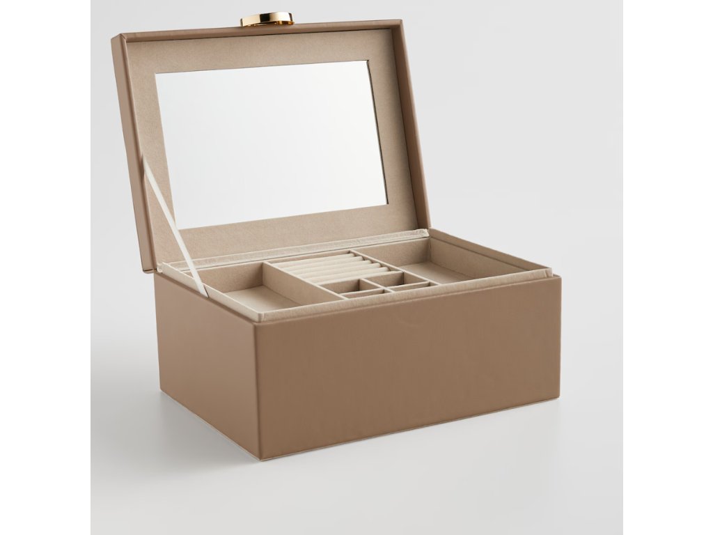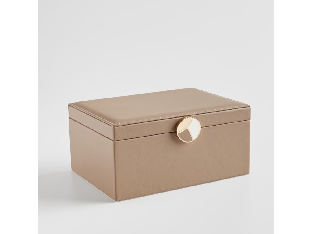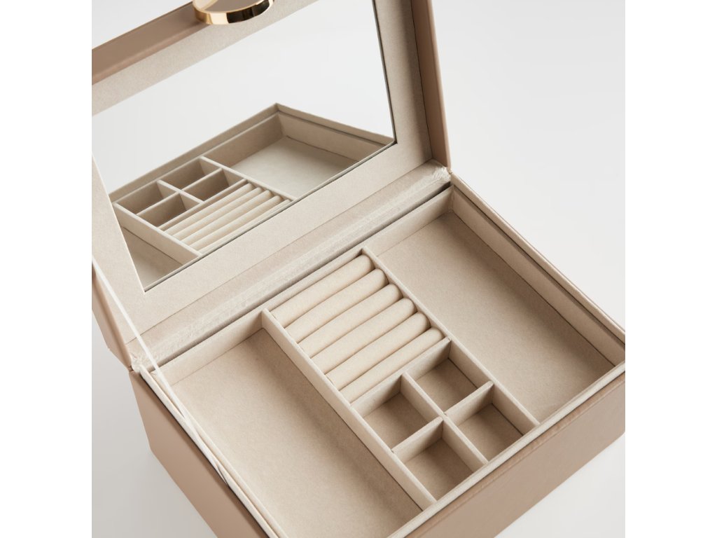 Šperkovnica v tmavobéžovej farbe je elegantná a klasická voľba na uloženie cenných drobností. Jej sýty, tlmený odtieň dokonale ladí s rôznymi interiérmi a dodáva im teplo a sofistikovaný charakter. Je ideálna na uloženie šperkov, hodiniek alebo iných pokladov, pričom spája funkčnosť s nadčasovým štýlom.