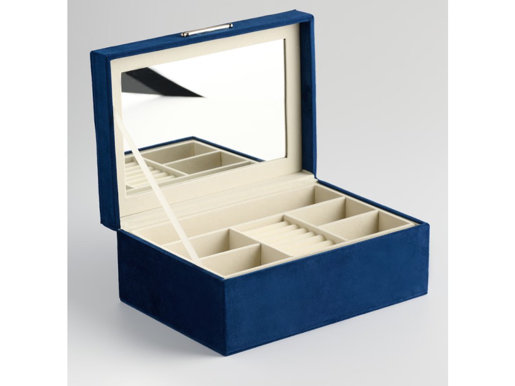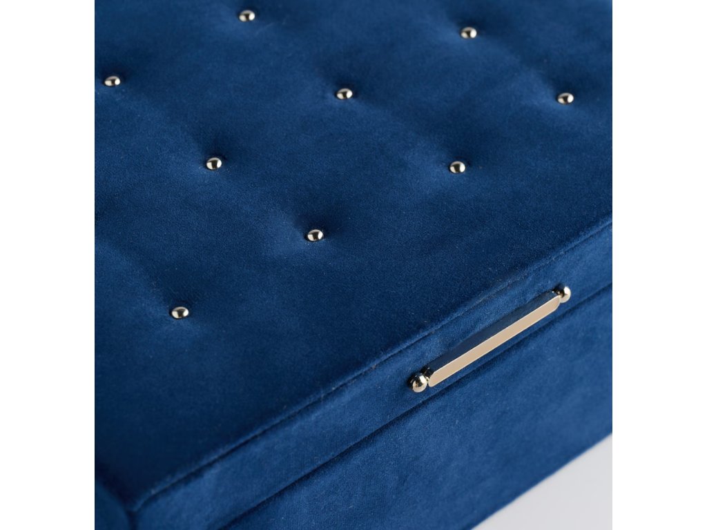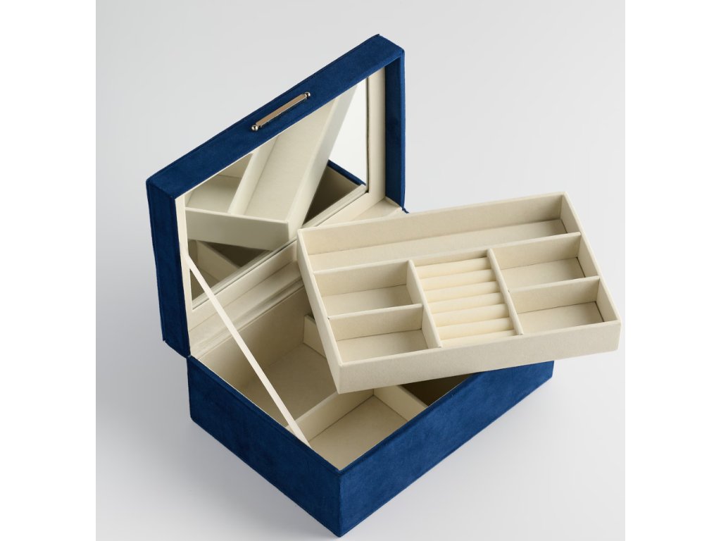 Šperkovnica z mäkkého zamatu (velúru) s prímesou materiálu MDF a papiera, v elegantnej tmavomodrej farbe. Jej luxusná textúra a štýlový dizajn ju robia ideálnou na uskladnenie šperkov a drobných predmetov, zároveň dodáva interiéru rafinovaný charakter. Šperkovnica spája estetiku a funkčnosť a jej pevná konštrukcia zabezpečuje trvácnosť. Je dokonalá do spálne alebo šatníka, predstavuje nielen praktický, ale aj dekoračný prvok interiéru.