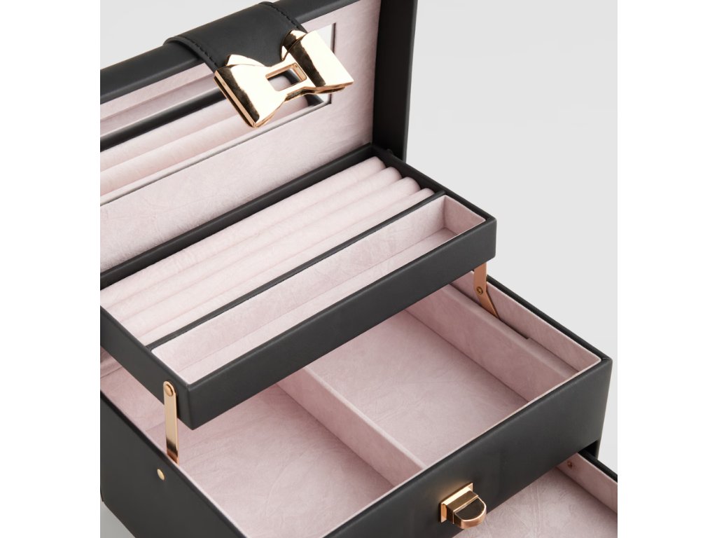 Predstavte si chvíľu relaxu, keď otvoríte elegantnú Šperkovnicu Patty a vašim očiam sa ukážu starostlivo uložené poklady. Táto výnimočná šperkovnica, vyrobená s dôrazom na detaily, zabezpečí poriadok, bezpečnosť a nádych luxusu vo vašej každodennosti. Jej výnimočný dizajn dodá šmrnc každému toaletnému stolíku.