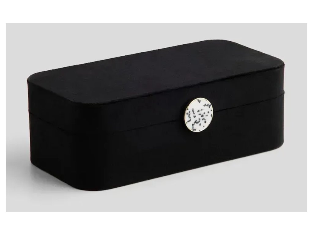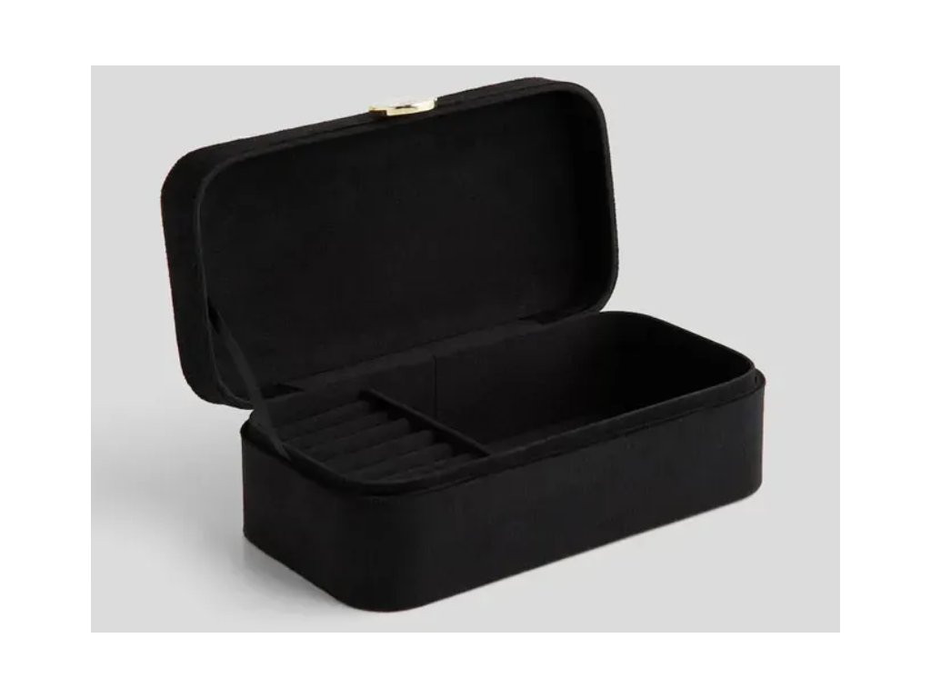 Elegantná šperkovnica na šperky, zhotovená z mäkkého luxusného zamatu (velúru) v sýtej čiernej farbe, sa stane vycibreným akcentom v každom interiéri. Jemná tkanina a vkusný vonkajší vzhľad nielenže zaisťujú bezpečné uloženie prsteňov, náhrdelníkov a náramkov, ale tiež dodávajú interiéru dodatočnú eleganciu. Táto šperkovnica je ideálnou voľbou pre tých, ktorí oceňujú krásu a praktickosť, a taktiež sa perfektne hodí ako štýlový darček, ktorý príjemcu zaujme a poteší.
