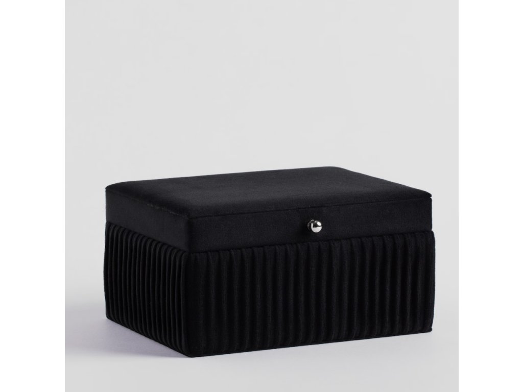 Čierna šperkovnica je kvintesenciou elegancie a funkčnosti. Je vyrobená z vysokokvalitných materiálov a pokrytá mäkkým, zamatovým vyhotovením, prezentuje luxusný vzhľad zvonku aj zvnútra. Táto šperkovnica nielenže chráni vaše cenné poklady, ale tiež dodáva triedu a štýl každému toaletnému stolíku, čím je skvelou voľbou pre každého, kto si cení elegantné a praktické riešenia.