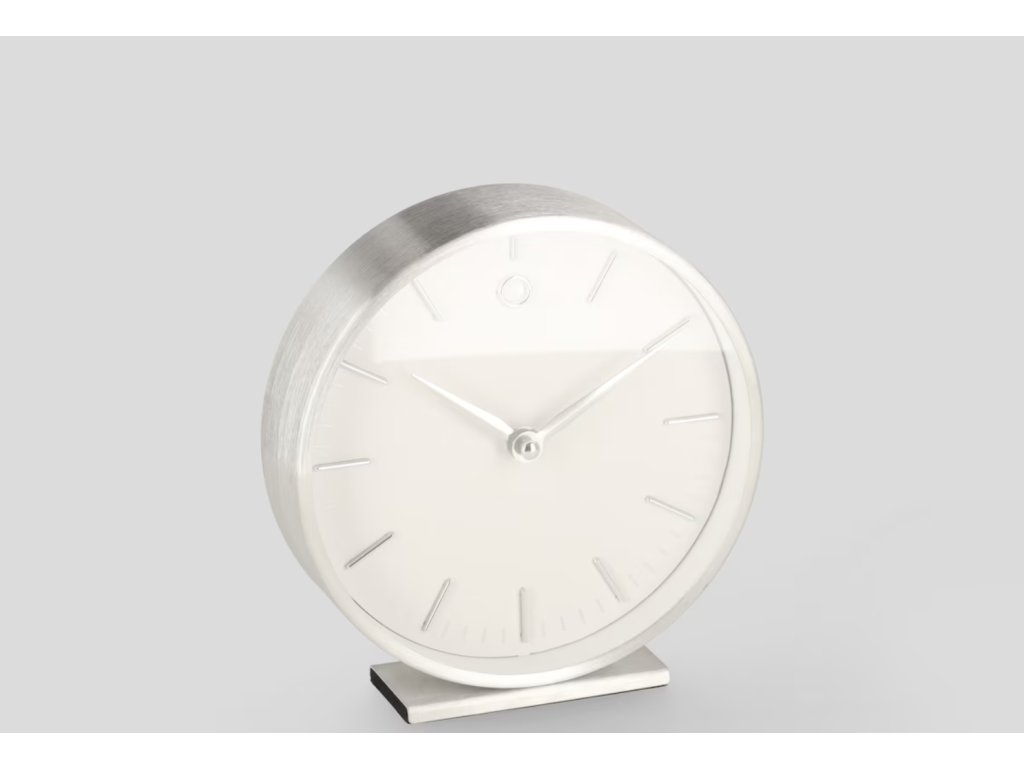 Stolové hodiny z kovu s prímesou plastu vo svetlostriebornej farbe s rozmermi 15,5 cm x 4 cm x 15 cm. Elegantné a moderné, dokonale sa osvedčia ako štýlový doplnok na pracovný stôl, poličku či stolík. Ich minimalistický dizajn a subtílna farebnosť dodávajú eleganciu a moderný charakter, ideálne sa hodiace k rôznym aranžmánom interiérov.