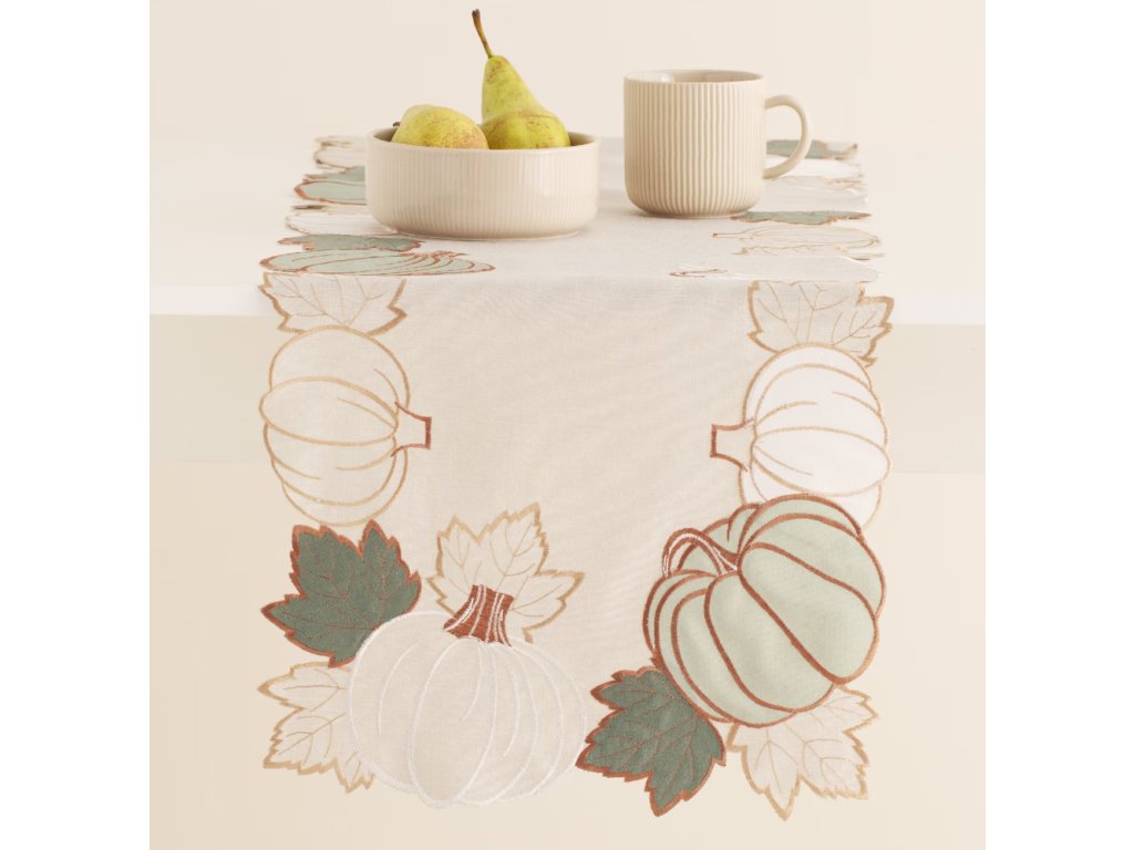 Behúň s tekvicovým vzorom, vyrobený z polyesteru s prímesou viskózy, s rozmermi 38 cm x 160 cm je elegantný a funkčný doplnok na váš stôl, ktorý vnesie do jedálne teplý a útulný akcent. Použitie polyesteru a viskózy zaručuje nielen estetický vzhľad, ale aj trvácnosť a ľahkú údržbu. Svetlá, tekvicová farba behúňa dodáva nádych sviežosti a radosti, dokonale sa hodiaca k jesenným aranžmánom a iným dekoračným farbám.
