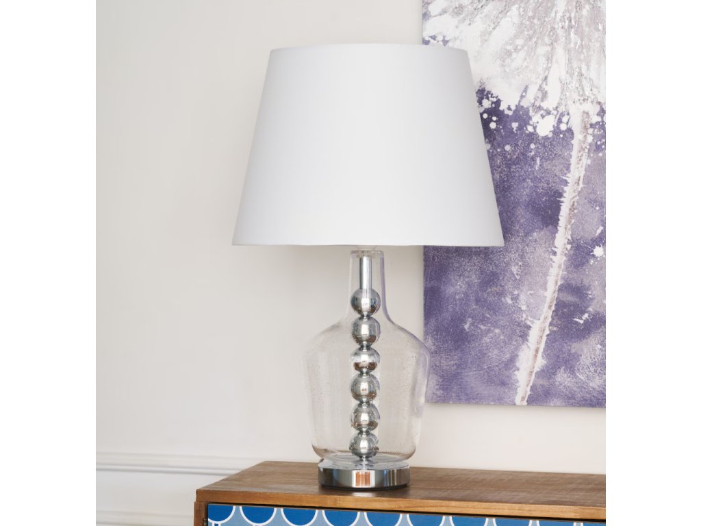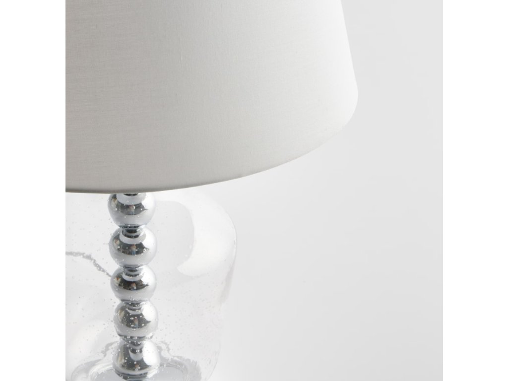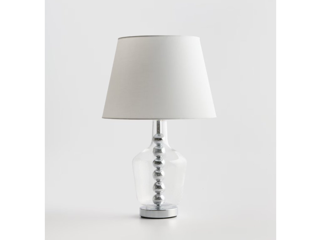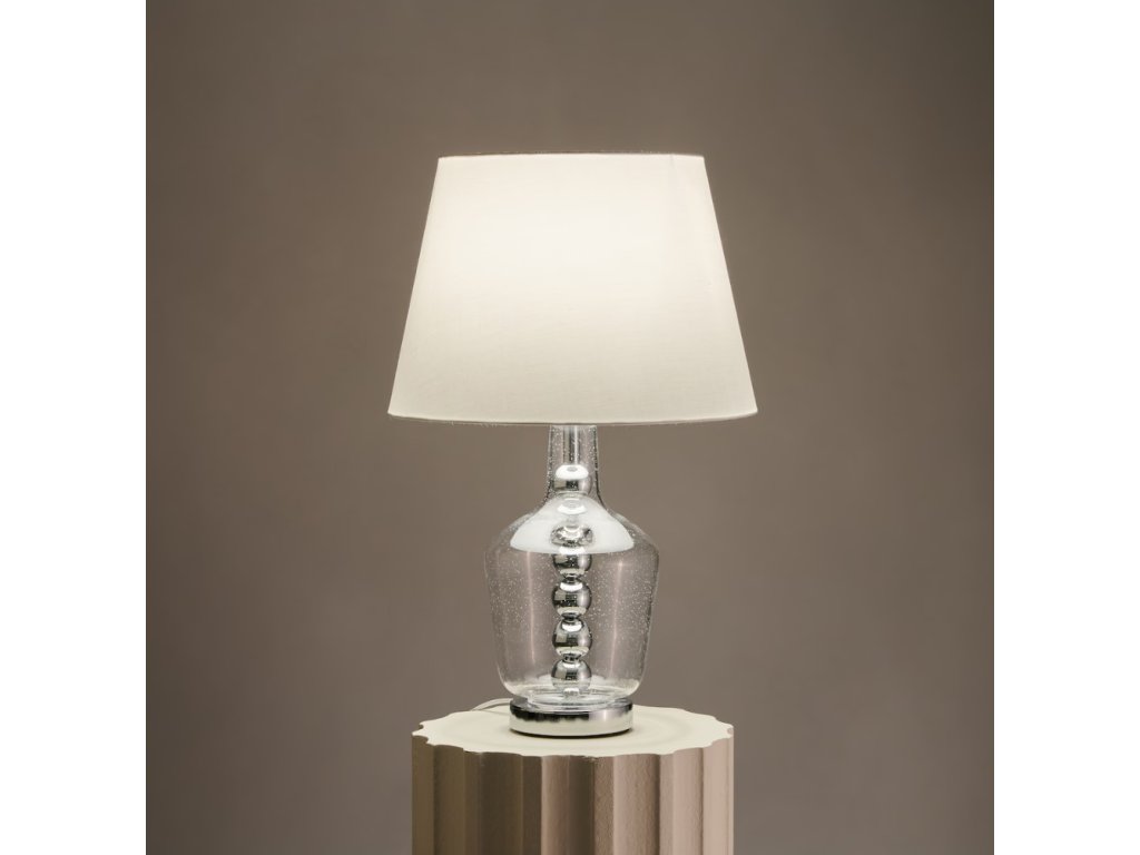 Podstavec lampy Hannah je vyrobený z vysokokvalitného priehľadného skla, ktoré sa vyznačuje trvácnosťou a odolnosťou voči každodennému používaniu. Sklenený povrch uľahčuje údržbu čistoty a pôsobí mimoriadne esteticky. Chrómované gule umiestnené vo vnútri podstavca dodávajú lampe ľahkosť a luxusný charakter. Tienidlo z hladkej tkaniny jemne rozptyľuje svetlo, vytvárajúc príjemnú, útulnú atmosféru na odpočinok alebo prácu.