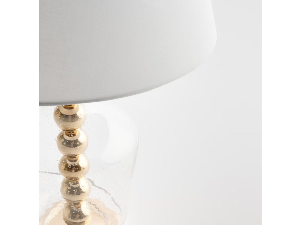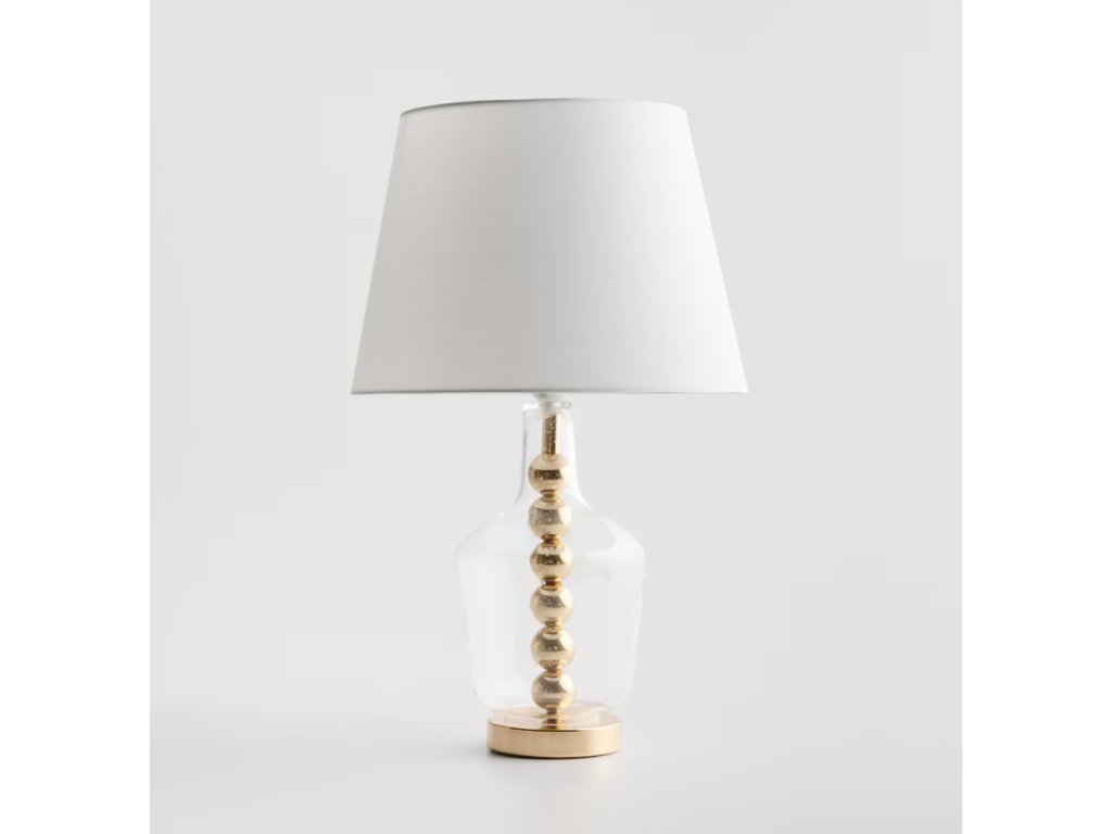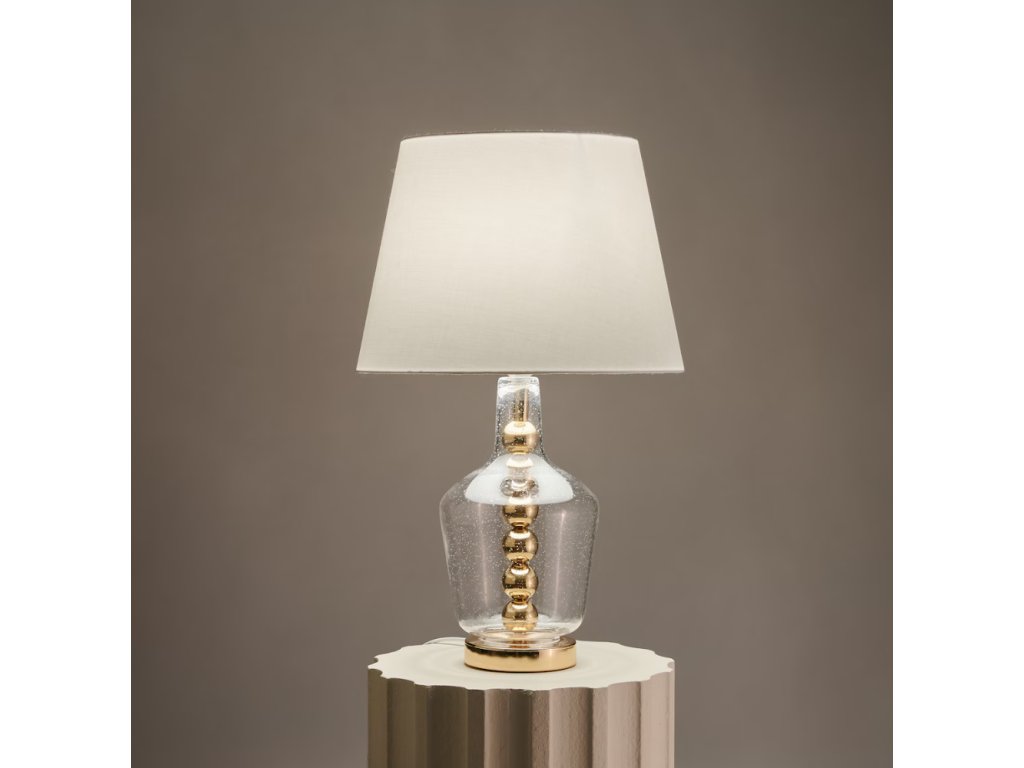 Stolová lampa Hannah bola vyrobená z transparentného skla a kovu a má tienidlo z tkaniny. Hladký povrch skla spolu so zlatými, dekoračnými guľami uzatvorenými v podstavci vytvárajú dojem ľahkosti a zároveň solídnosti. Sklo sa ľahko udržiava v čistote a dodáva interiéru nadčasovú eleganciu. Vysokokvalitná tkanina tienidla jemne rozptyľuje svetlo, čím sa stará o príjemnú atmosféru miestnosti – ideálna na každodenné používanie.
