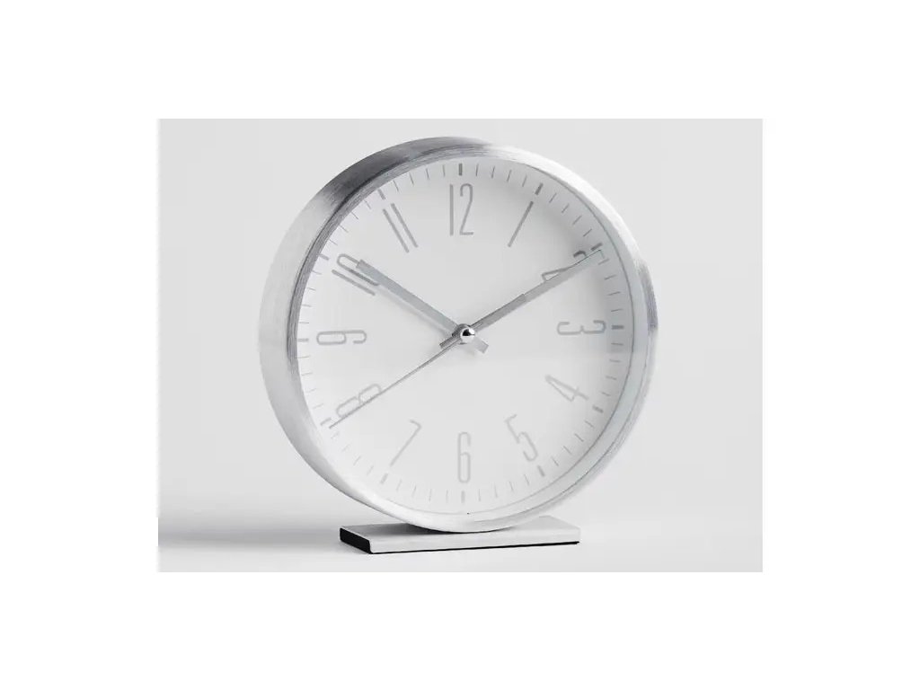 Okrúhle stolové hodiny, ktoré stoja na plochom podstavci. Produkt sa vyznačuje striebornou farbou puzdra, čiernymi ručičkami a čiernymi číslicami, ktoré v kombinácii s bielym ciferníkom pôsobia luxusne a elegantne. Stolové hodiny možno použiť ako ozdobu na komode, stole, pracovnom stole alebo akejkoľvek inej ploche, kde budú na očiach.