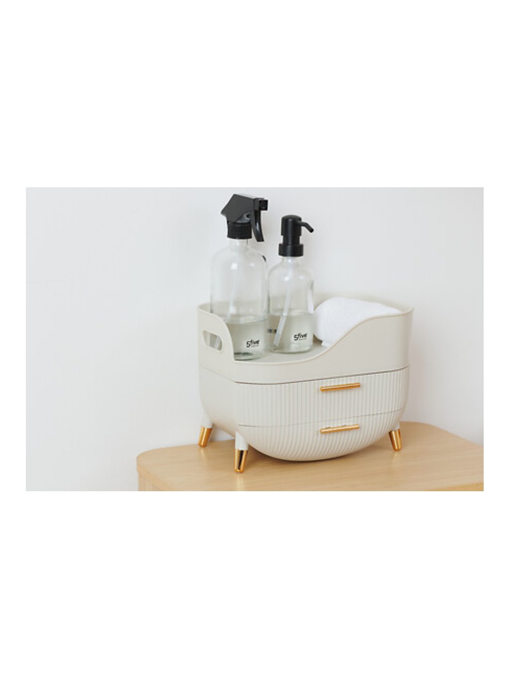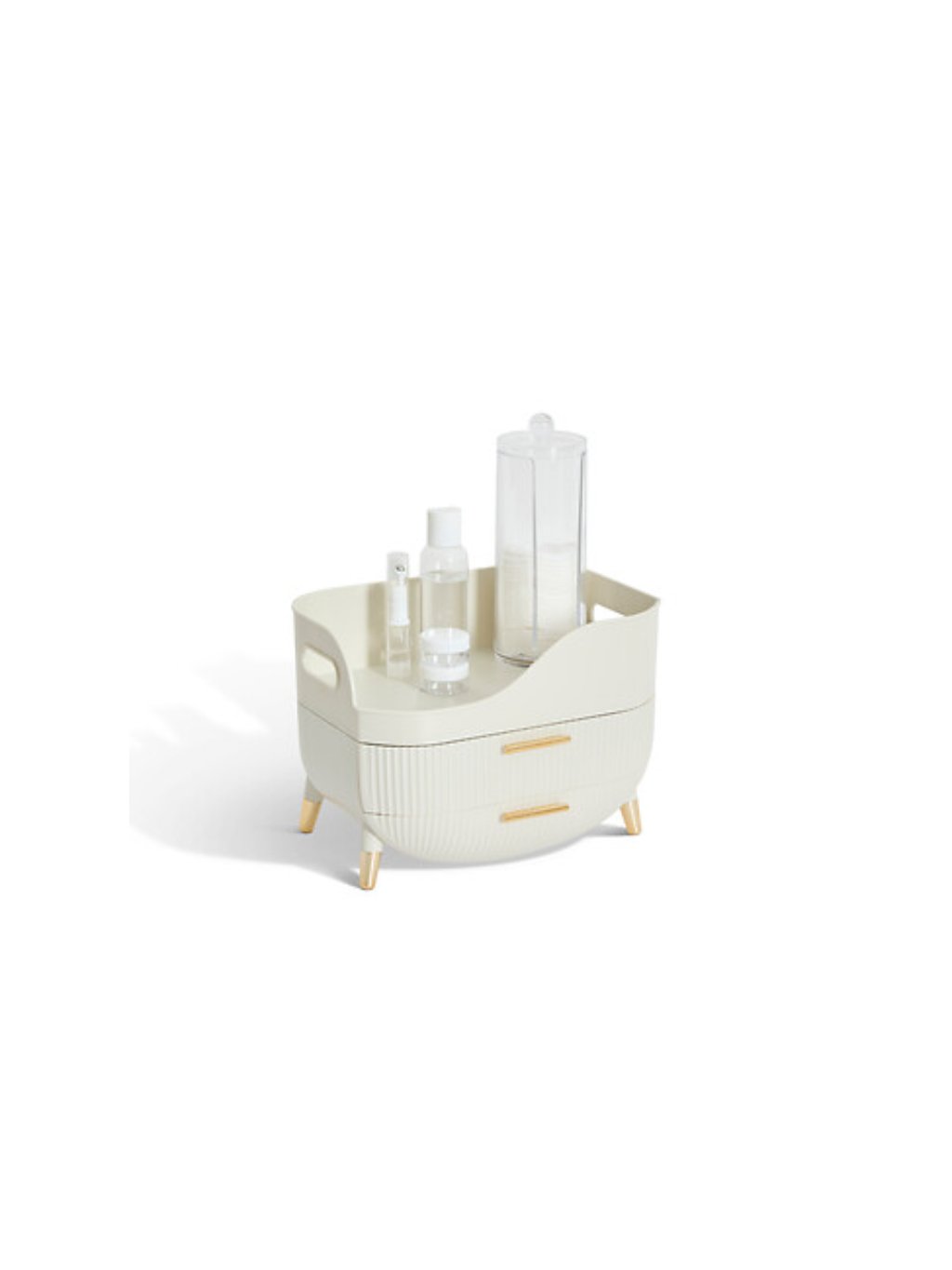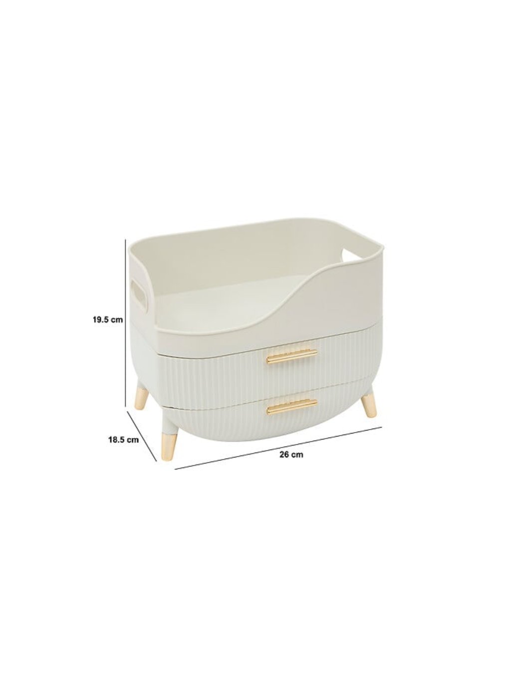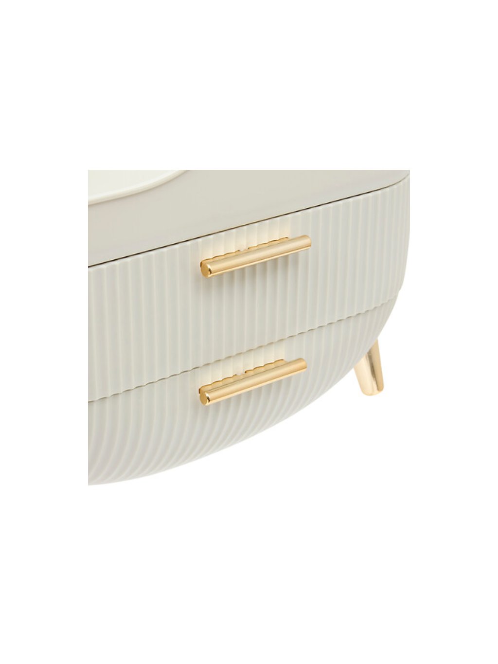 Všestranná organizácia: Obsahuje 3 otvorené priehradky rôznych veľkostí na predmety, ktoré potrebujete mať poruke (štetce, perá, krémy), a 2 zásuvky na uschovanie drobností, ktoré chcete skryť.