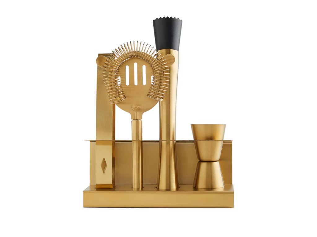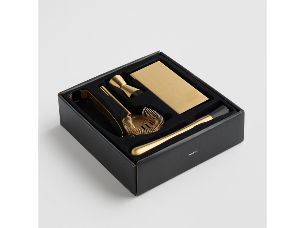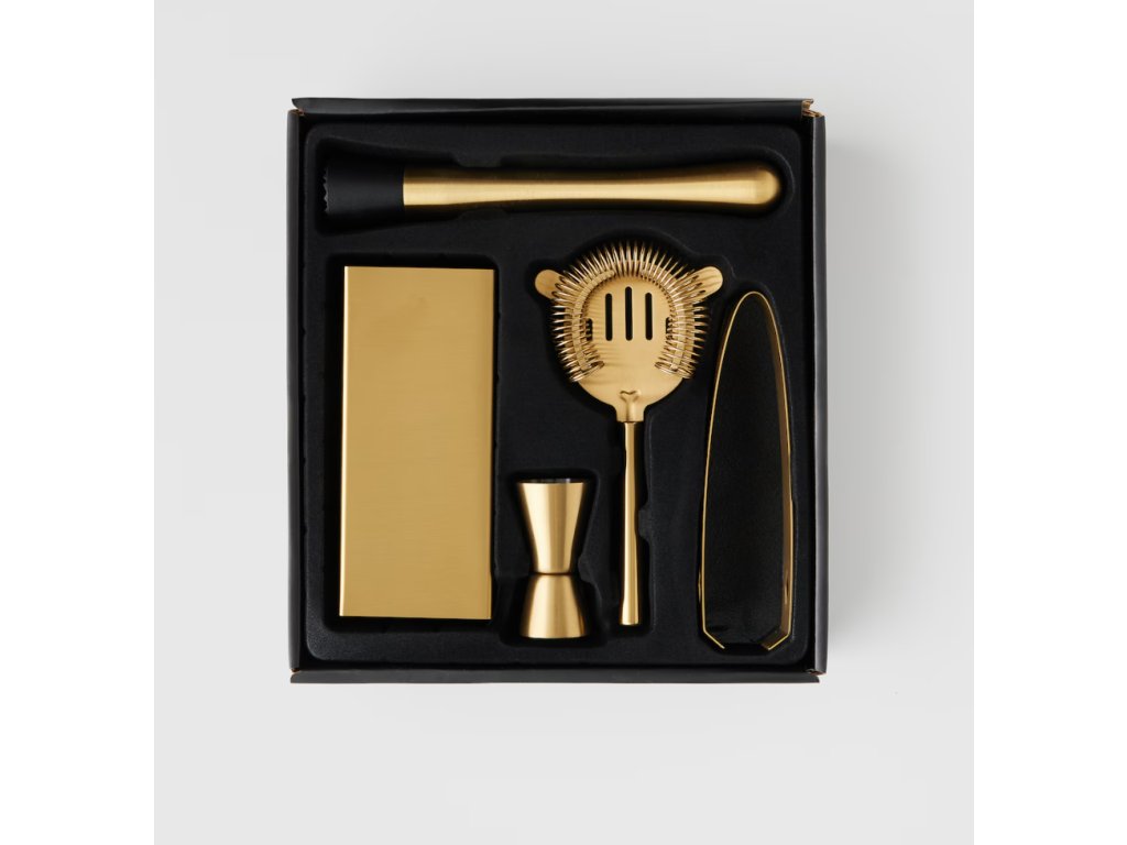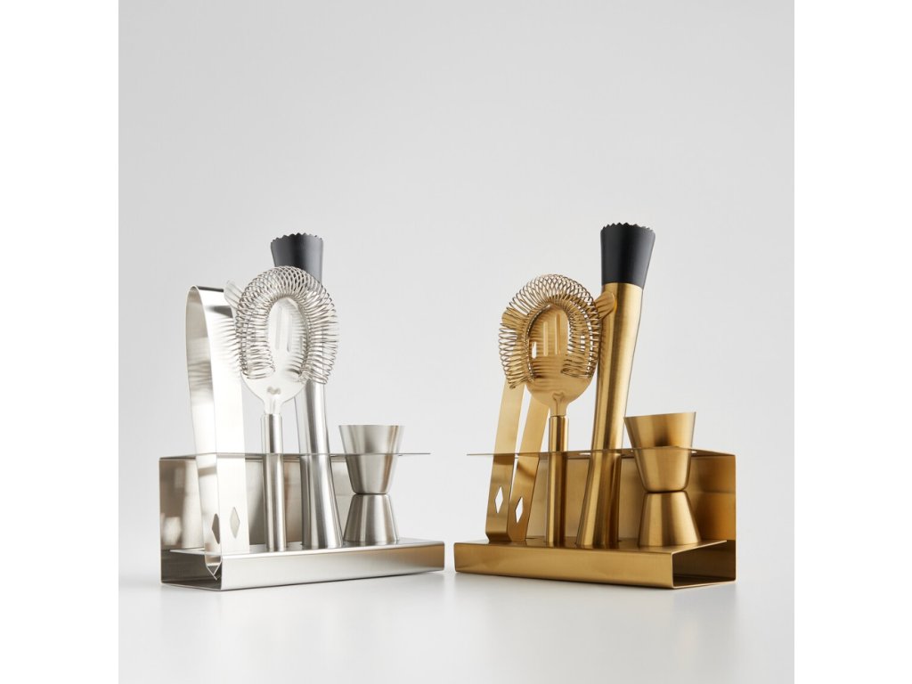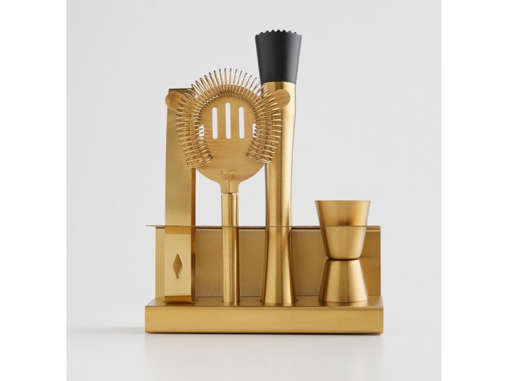 Exkluzívna súprava barového príslušenstva je vyrobená z vysokokvalitnej nehrdzavejúcej ocele v pôsobivej zlatej farbe. Súprava spája funkčnosť s elegantným dizajnom, vďaka čomu sa dokonale hodí do domáceho baru. Súprava obsahuje precízne vyrobené prvky, ktoré sú ideálne na miešanie, odmeriavanie a servírovanie drinkov. Luxusný vzhľad v kombinácii s trvácnosťou materiálu robí z tejto súpravy ideálny tip na darček alebo štýlový doplnok do interiéru.