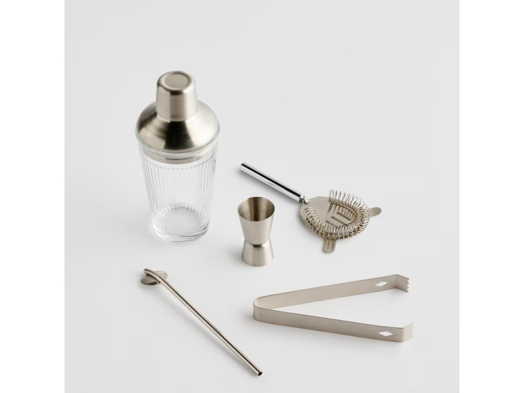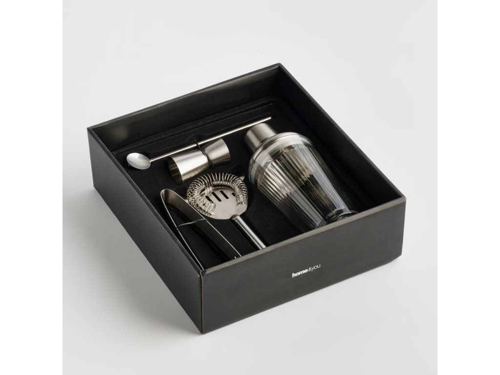 Súprava obsahuje 5 prvkov: šejker, odmerku, barové sitko, barovú lyžicu a kliešte na ľad. Rozmery: Výška: 10 cm, Šírka: 29 cm, Dĺžka: 26 cm.