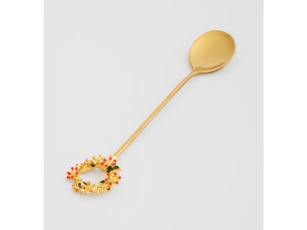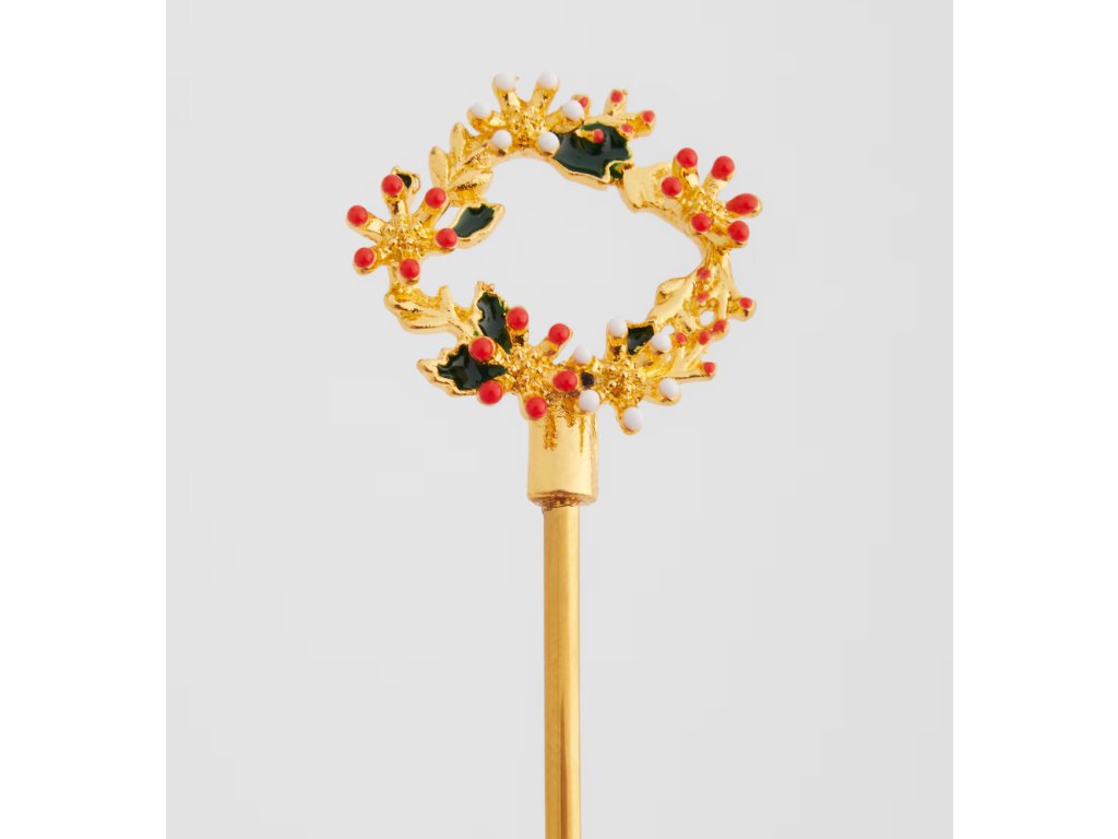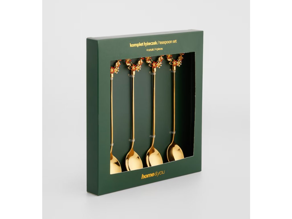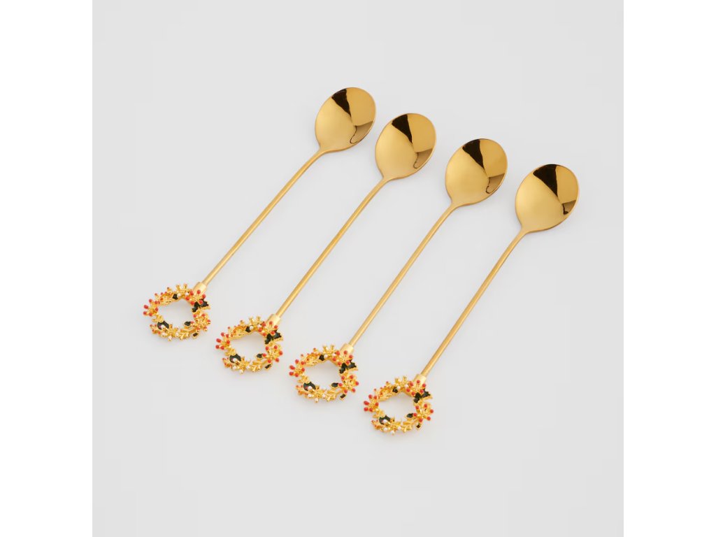 Súprava 4 čajových lyžičiek Jule je vyrobená z lesklej zlatej nehrdzavejúcej ocele a má predĺženú dĺžku 15 cm, ideálnu pre vysoké poháre. Rukoväte sú zakončené dekoratívnym krúžkom/vencom zdobeným malými krištálikmi a farebnými emailovými lístkami (červené, zelené, zlaté). Tento tradičný rastlinný motív dodáva lyžičkám nádych vianočného glamouru. Sú perfektné na podávanie vianočného punču, horúcej čokolády, kávy, alebo dezertov a sú skvelým, štýlovým tipom na darček.