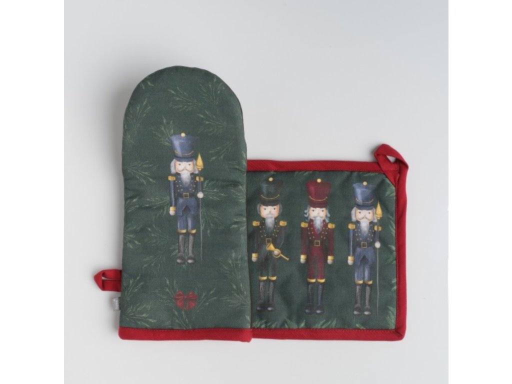 Táto kuchynská chňapka a podložka s motívom Luskáčikov v elegantnej zelenej farbe s červeným lemovaním prinesie do vašej kuchyne vianočnú atmosféru a štipku sviatočnej mágie. Je to ideálny doplnok pre všetkých, ktorí milujú vianočné pečenie a varenie a chcú mať zároveň štýlové a praktické pomôcky.