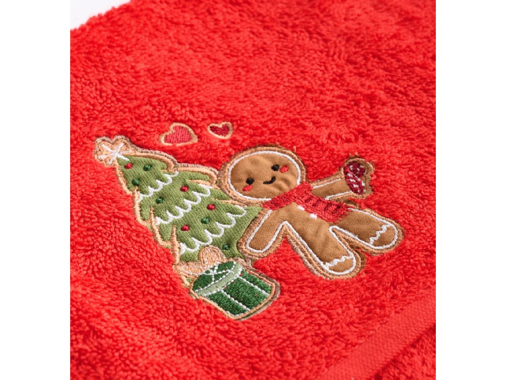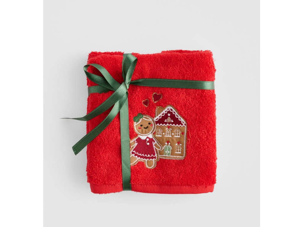 Intenzívna červená farba uterákov je doplnená starostlivo vyhotovenými výšivkami s motívom perníka, domčeka či srdiečok, ktoré okamžite evokujú sviatočnú atmosféru. Zelená stužka a precízne zakončenie okrajov podčiarkujú kvalitu spracovania, vďaka čomu je súprava Ginno vynikajúcou dekoráciou do kúpeľne alebo kuchyne, ako aj hotovým, štýlovým darčekom na sviatky.