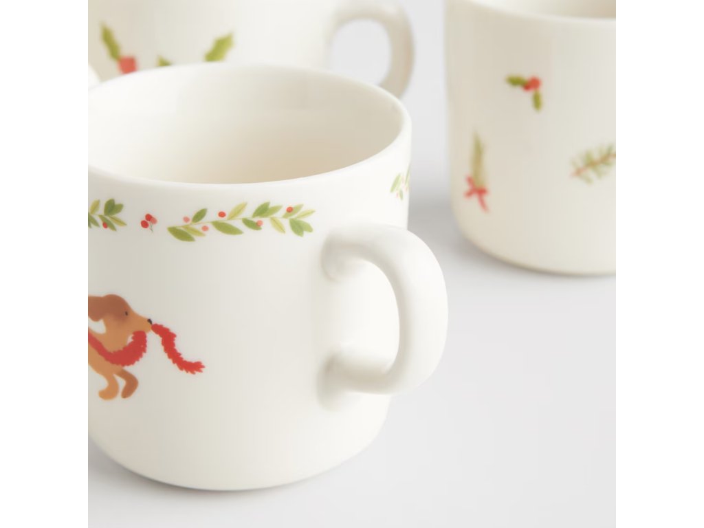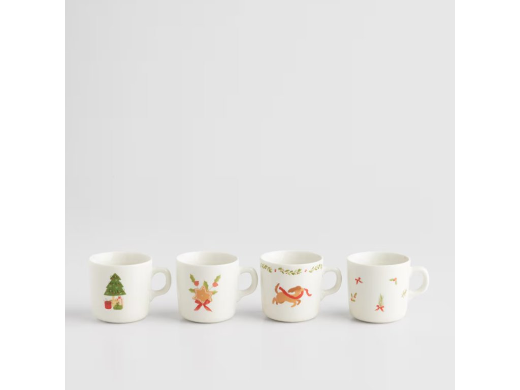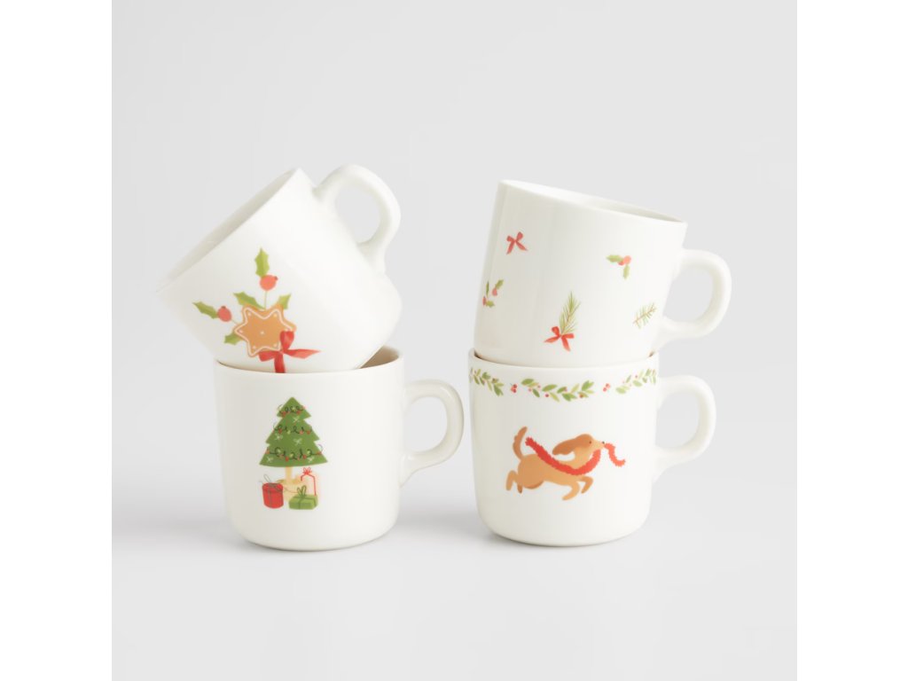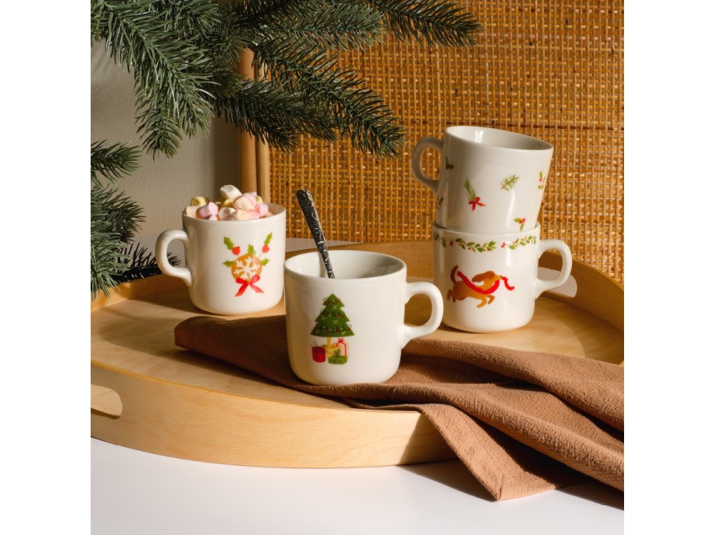 Každý zo štyroch hrnčekov zdobí iný, roztomilý sviatočný motív: vianočný stromček s darčekmi, sviatočná mašľa s vetvičkou cezmíny, jazvečík vo vianočnom šále a vetvičky ihličia s červenými bobuľami. Viacfarebné vzory na bielom pozadí dodávajú hrnčekom výnimočný charakter. Súprava ideálne zapadá do sviatočnej atmosféry, dodáva interiéru útulnosť. Je to tiež vynikajúci nápad na darček pre blízku osobu.