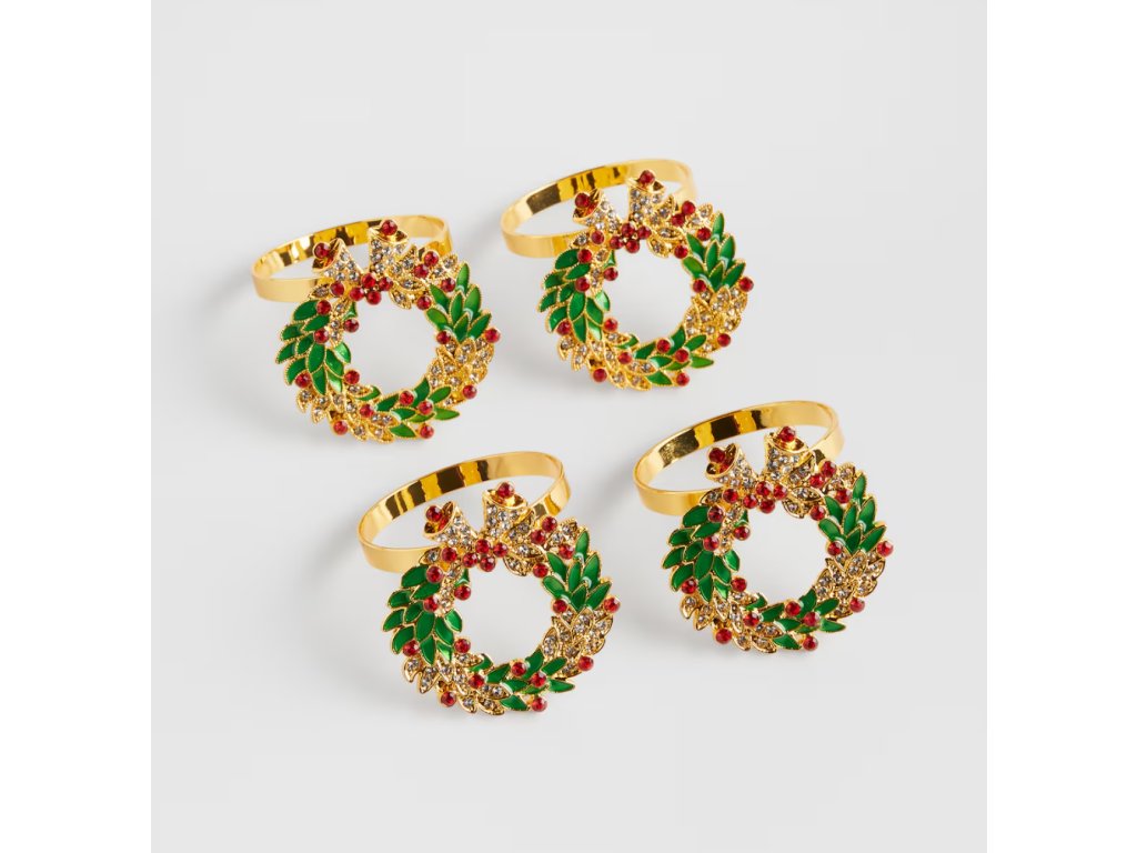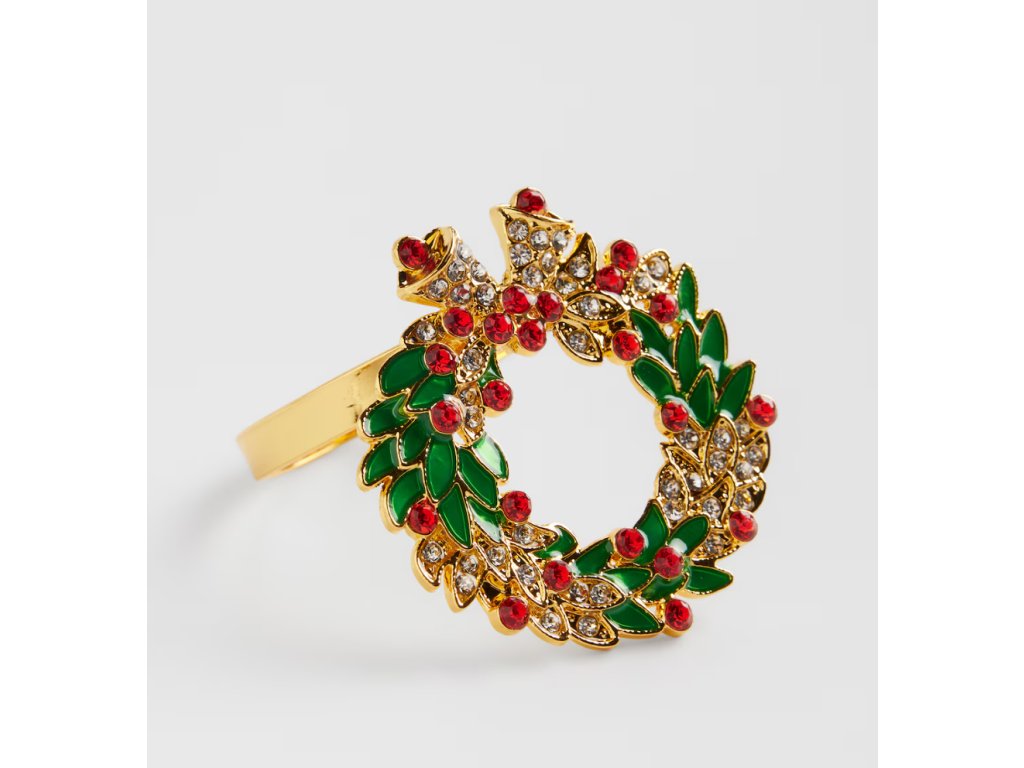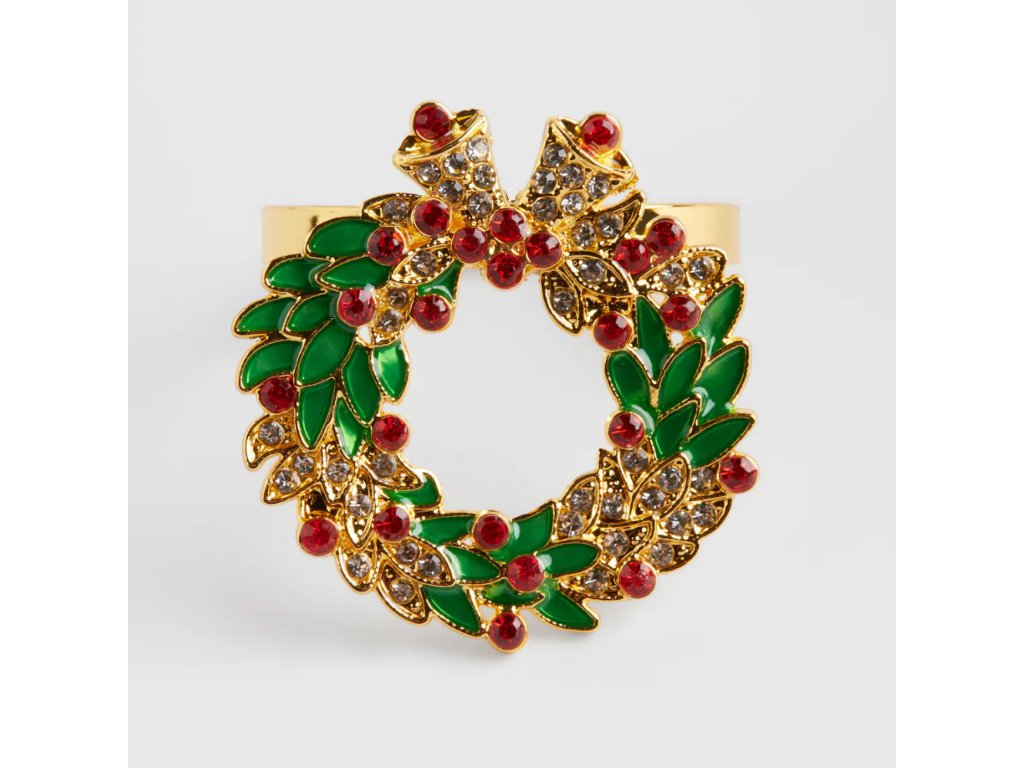 Dodajte svojmu vianočnému stolovaniu punc luxusu s týmito elegantnými krúžkami na obrúsky Godjule. Sú kľúčovým detailom, ktorý premení každý obrúsok na slávnostný prvok dekorácie. Krúžky sú vyrobené z lesklého zlatého kovu a zdobené miniatúrnym vencom s motívom betlehemskej hviezdy. Vďaka trblietavému plastovému zdobeniu v červenej a zelenej farbe sa hodia k tradičným vianočným farbám. Súprava obsahuje 4 krúžky na obrúsky s rozmermi 4,5cm, na výšku a 4,4 cm na dĺžku, čo z nich robí ideálny, elegantný a tradičný doplnok na slávnostnú večeru .