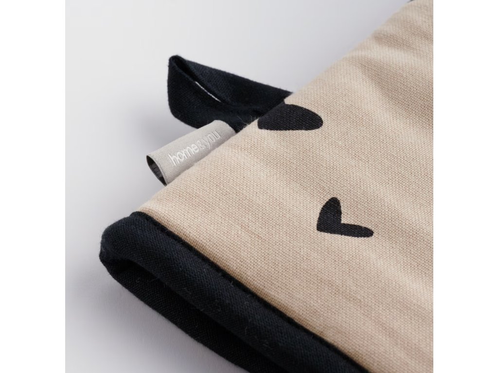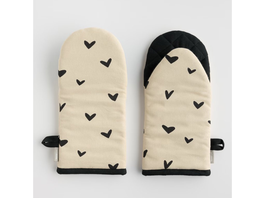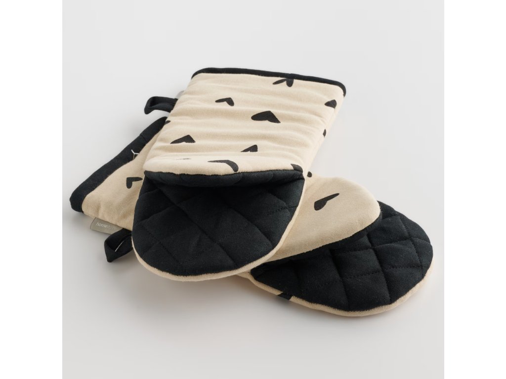 Súprava kuchynských chňapiek z bavlny v béžovej farbe s čiernymi ozdobami v tvare sŕdc je elegantným a praktickým doplnkom do každej kuchyne. Sú vyrobené z mäkkej, ale trvácnej bavlny, a tak poskytujú ochranu pri varení alebo pečení. Decentný motív sŕdc im dodáva pôvab a vnáša do interiéru kuchyne trochu štýlu a tepla.