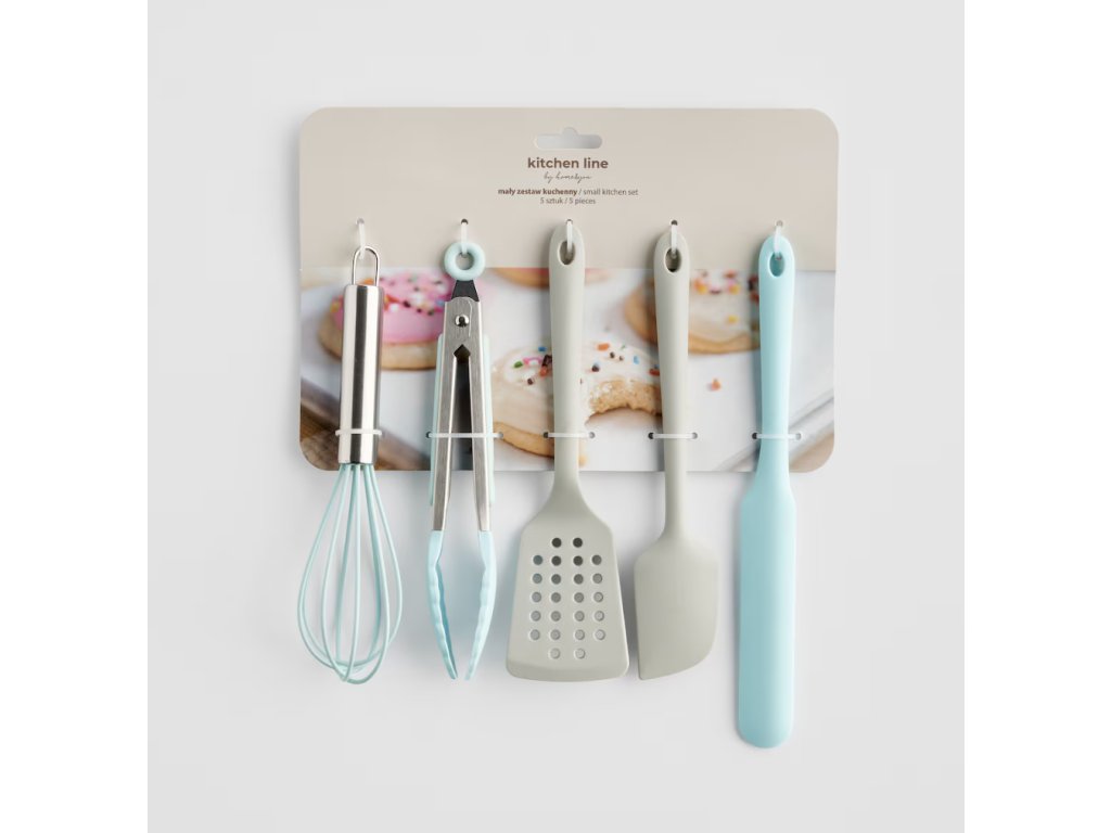 Táto 5-dielna súprava v moderných pastelových farbách (sivá a svetlomodrá) kombinuje silikón a nehrdzavejúcu oceľ. Je ideálna pre amatérskych cukrárov a kuchárov.