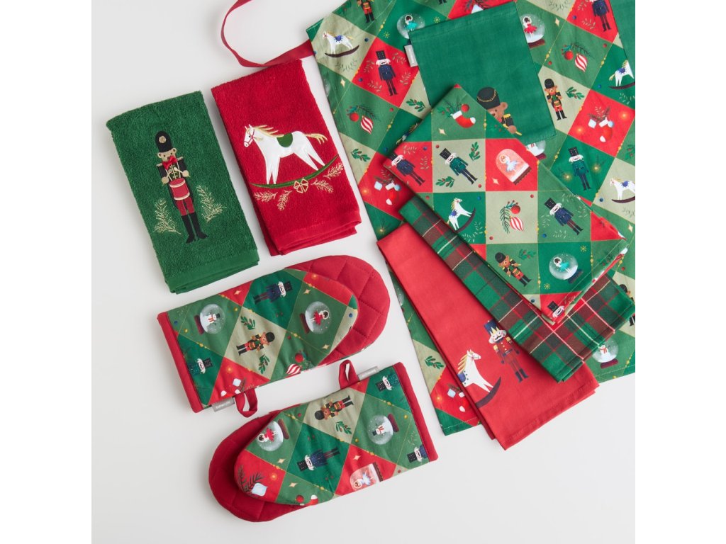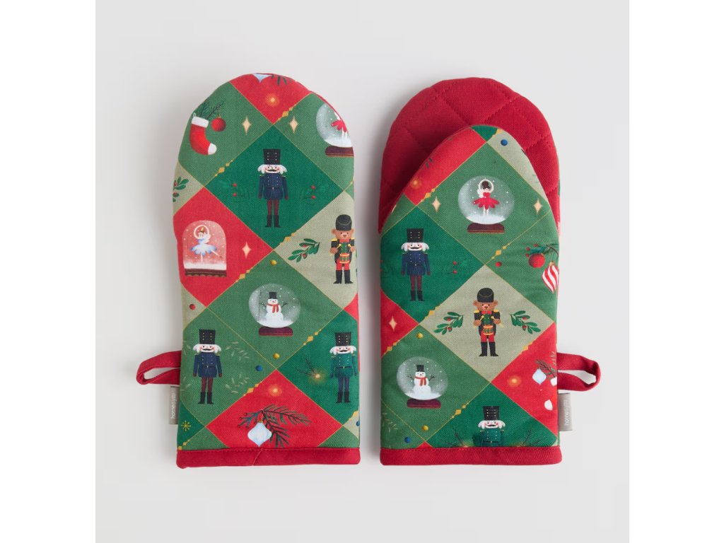 Vianočný vzor s motívom vojačika (luskáčika), vianočných stromčekov a dekorácií v intenzívnych farbách zelenej a červenej zaisťuje, že sa súprava rukavíc Nutpatcher ideálne hodí do atmosféry rodinných, zimných stretnutí pri spoločnom stole. Spojenie dekoratívnej estetiky s funkčnosťou ich robí výnimočným prvkom vybavenia každej kuchyne – tak klasickej, ako aj modernej. Univerzálny charakter a estetika zaisťujú, že sa súprava skvele hodí ako darček pre milovníkov kulinárskych výziev a vianočných tradícií.