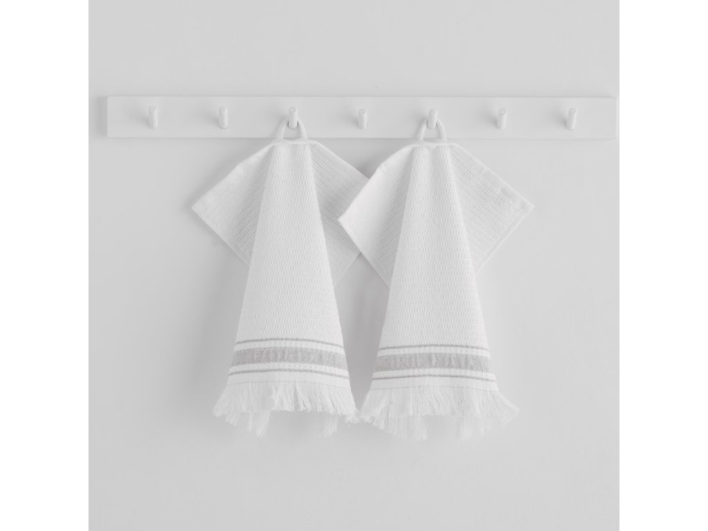 Súprava dvoch kuchynských utierok z bavlny je elegantným a praktickým riešením do kúpeľne alebo kuchyne. S rozmermi 30 cm x 30 cm sú ideálne na každodenné použitie, napríklad na osušenie rúk alebo utretie drobných predmetov. Utierky sú vyrobené z vysokokvalitnej zmesi bavlny a polyesteru, čo im dodáva trvácnosť a mäkkosť. Gramáž 450 g/m² zaručuje, že účinne absorbujú vodu a rýchlo schnú, čo je pri každodennom používaní kľúčové. Sivý lem dodáva utierkam elegantný vzhľad a charakter. Je to decentný akcent, vďaka ktorému utierky pôsobia ešte štýlovejšie a exkluzívnejšie. Súprava dvoch kusov navyše zaručuje, že budete mať vždy po ruke náhradnú utierku, čo je praktické doma aj na cestách. Vďaka jednoduchej údržbe sú navyše praktickým a funkčným prvkom vybavenia každej kúpeľne alebo kuchyne.