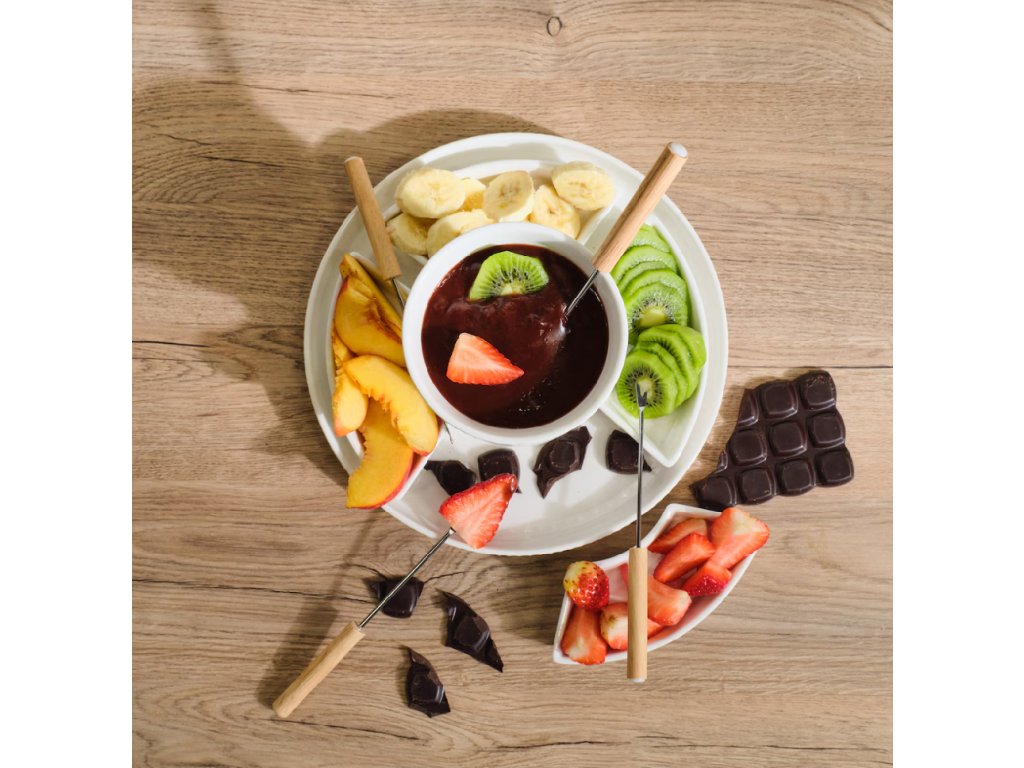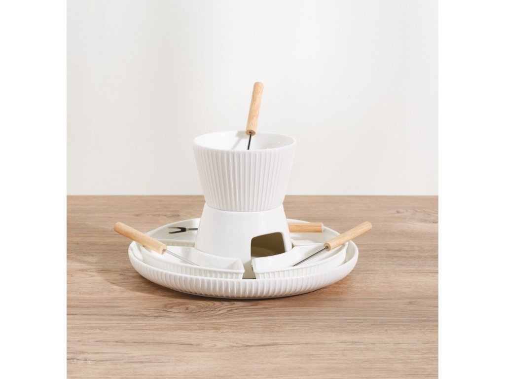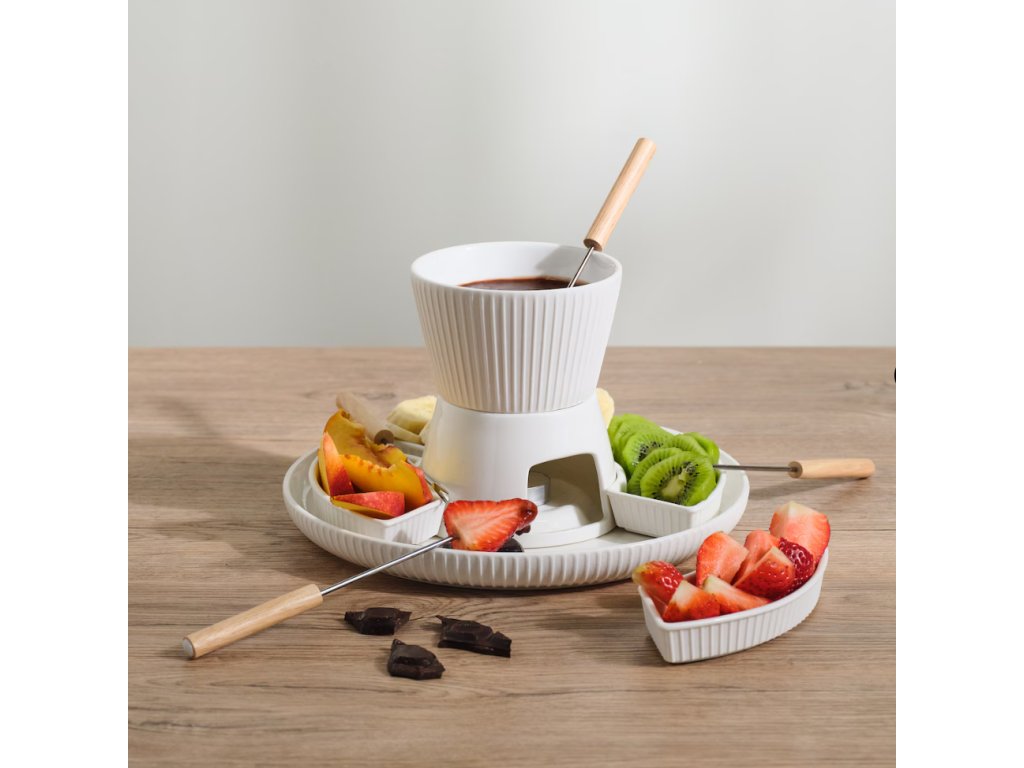 Elegantná súprava na fondue z porcelánu v klasickej bielej farbe. Ideálna na servírovanie rozpustenej čokolády alebo omáčok. Jednoduchý, no zároveň štýlový dizajn zaručuje, že súprava dokonale zapadne do rôznych stolových aranžmánov a spája funkčnosť s estetikou.