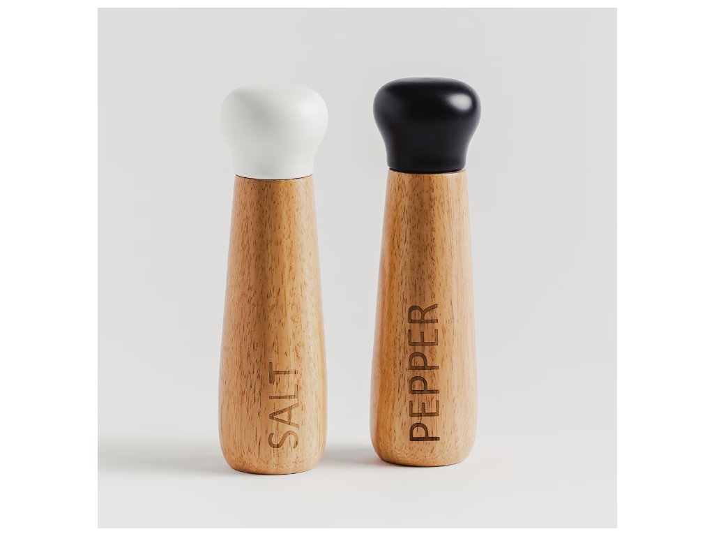 Komplet ručných mlynčekov na soľ a korenie, vyrobených z kaučukového dreva v elegantnej hnedej farbe. Štýlový a funkčný doplnok do kuchyne alebo jedálne, ktorý zaisťuje presné mletie korenín a zároveň zvýrazňuje chuť jedál. Prírodné drevo im dodáva klasický vzhľad a ergonomický tvar uľahčuje pohodlné používanie. Mlynčeky sú trvácne a estetické, ideálne na každodenné použitie aj na špeciálne príležitosti, a stolu dodajú eleganciu a teplo.